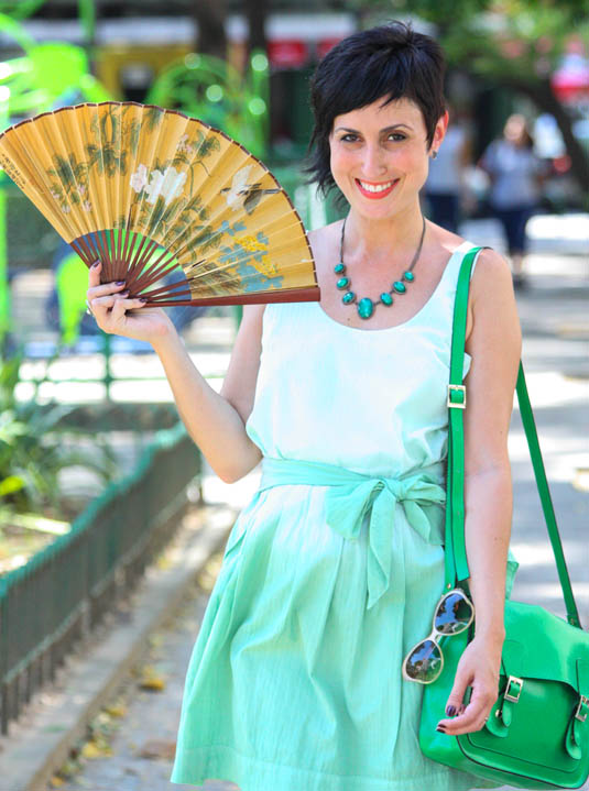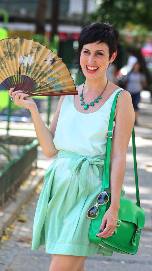 9. nossa, que legal! sabe que eu não pensaria num look assim bem quase todo verde? adorei. esse vestido é um amor.