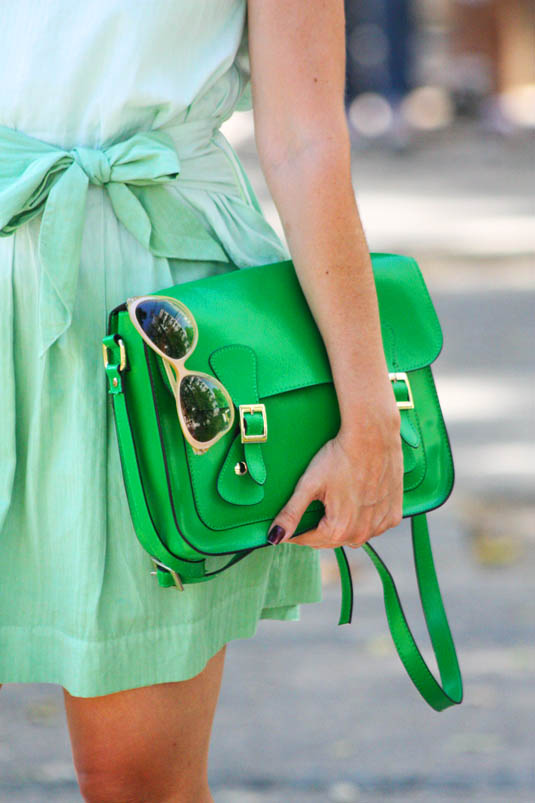 21. Amei o look, pois o verde está super em alta e é a cor do ano. Amei também a bolsa estilo cambridge satchel. Aqui no brasil tem umas bolsas mais baratas pra vender, a partir de R$ 99,00 igualzinha a essa. Tem no site Mônica Croisfelt, comprei uma lilás e amo muitooo, agora quero uma verde também.