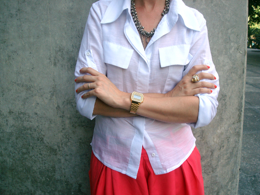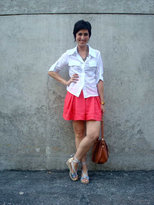 Na verdade a Taidje tinha usado um look com o short-saia igual ao meu e eu curti tanto que guardei como inspiração. E ontem, na preguiça, achei que seria uma ótima oportunidade de montar a minha versão! Usei espadrille simplesmente porque estou viciada no efeito alongador dela (e também por ser bem fresquinha para o verão!), mas mantive a proposta da camisa, sendo que essa tem a manga 3/4 e é beeeeeem fininha, por isso quase não esquenta. Aproveitei e deixei desabotoado o último botão para tornar o visual menos caretinha!