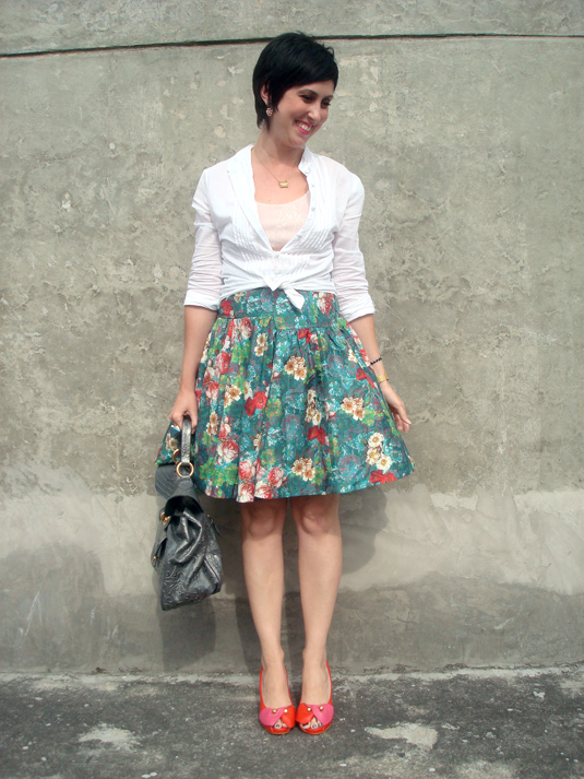 Com essa saia, gostei muito do sapato de hoje. Mas entre o look anterior e o de hoje, gostei mais da blusa e casaquinho do outro dia.
