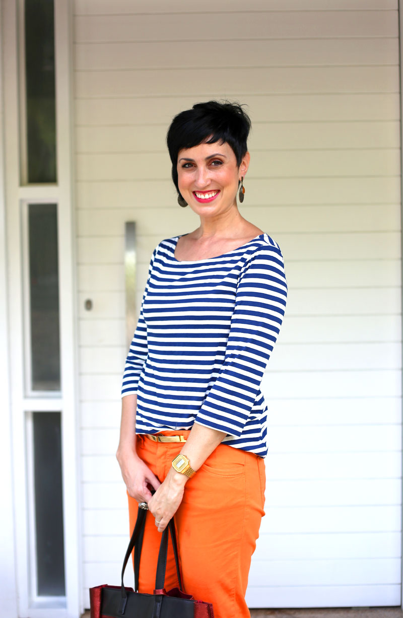 1. Adoro essa combinação do azul e branco da blusa com a calça laranja. Ficou lindão. Eu só trocaria o sapato porque não sou muito fã de oncinhas. Mas tá anotado mentalmente copiar sua inspiração de laranja + navy! 🙂