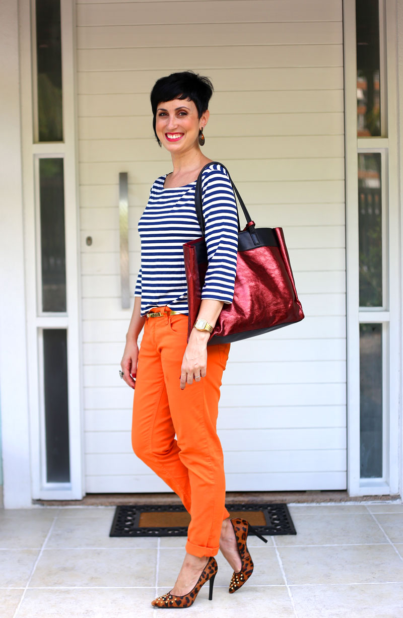 Meu treino dessa vez foi com um navy mais moderninho, então misturei à blusa listrada muitas cores e mais uma estampa. Nav1234olução dos meus problemas, galera! Um clássico sem erros, que a gente só muda uma coisa aqui e ali e pronto! 🙂 A ideia foi mesclar o laranja com as listras e ainda contar com o clássico vermelho na bolsa, um metalizado moderninho. Ah, e oncinha. Amo, amo, oncinha e listras!