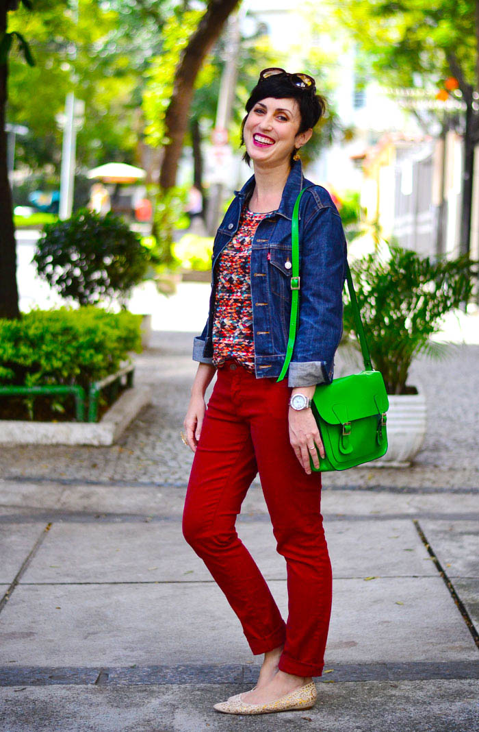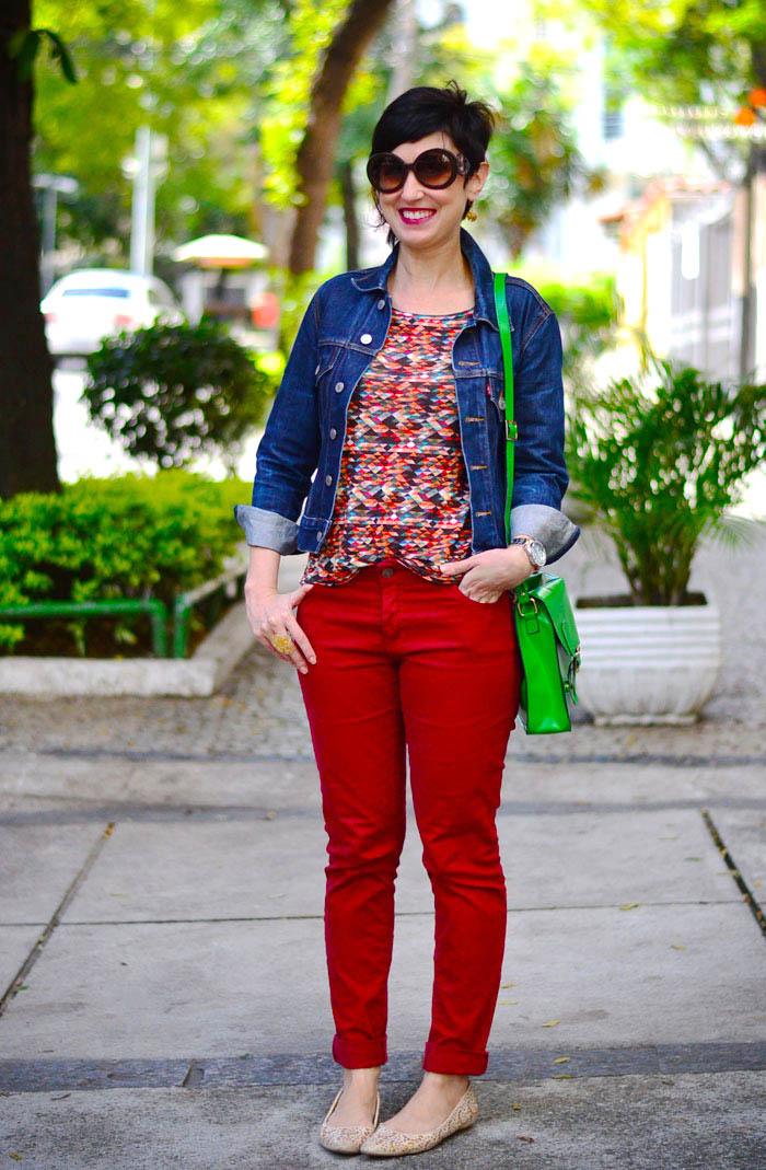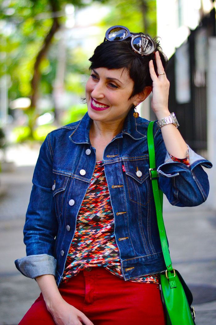 Aí tentei animar e fui naquela ideia que vocês já conhecem dos básicos não tão básicos: abusar das cores para criar interessância! A calça que comprei na Indistripe (lembram da minha visita à fábrica? E ela ainda vem super cheirosinha!) que tem elastano, ou seja, mais confortável, uma jaquetinha jeans e uma blusinha de malha, mas com estampa bem coloridona. E para dar mais contraste, a bolsa estilo carteiro verdona fluor! Curti MUITO! 😀