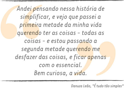 Talvez hoje eu tenha sido influenciada pelo livro da Danuza Leão que minha mãe me emprestou, “É tudo tão imples”. Leitura deliciosa dessa semana, onde Danuza dá dicas para a gente parar de complicar tudo e simplificar para sermos mais felizes, mesmo que isso signifique abrir mão de muita coisa. Eu estava meio descontrol com compras, apesar de ser muito comedida! Não dá pra comprar tudo que vejo por aí, infelizmente. Então se já tenho 5 saias longas, para que sair atrás de mais? Ou minha coleção de oxfords (ainda bem que nesse caso metade eu ganhei), que nem uso tanto assim? E como a própria autora descreve no livro, de que adianta ter tanta opção no armário, se ela opta sempre pelo jeans e camiseta? Ou quando queremos esvaziar o guarda-roupa e não temos para quem dar aquelas peças mais especiais. Identificação no ato, não é?!
