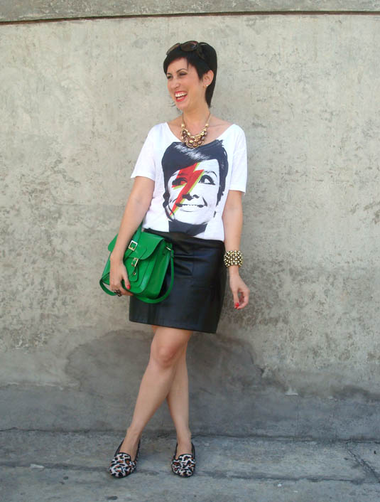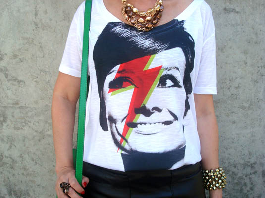 Como ontem fez um calor sufocante, resolvi não arriscar nada mais quente e apostei em uma roupa bem fresquinha e básica, sem complicações! Só que vocês já sabem que os básicos aqui nunca são tão básicos, né? rs! E olha a saia de couro fake aí, minha gente…usei no calor e não esquentou! Passou no teste! Estreei também essa t-shirt que foi caraaaaaaa demais para os meus padrões, mas eu amei tanto, TANTO essa estampa de Audrey a la Ziggy Stardust que eu não resisti, juntei uns cascalhos e arrematei. Ela é mais compridinha atrás, o que vai ser ótimo para usar com legging ou calças mais ajustadas. 🙂