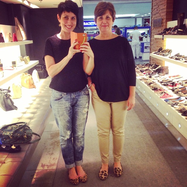 Nesse dia eu fui encontrar minha mãe no shopping, estava atrasada e botei uma roupa qualquer. Mas olha só a sinergia: quando vi minha mãe, estávamos praticamente com o mesmo look! Exceto a calça de tecido cáqui que ela usava, mas praticamente vestimos a mesma coisa! Blusa preta, sapato de oncinha e calça. 🙂 Eu estava com blusa de tricô Leader por 29,90, calça jeans boyfriend da C&A por 49,90 e sapatilha Wishin’ que ganhei da marca!