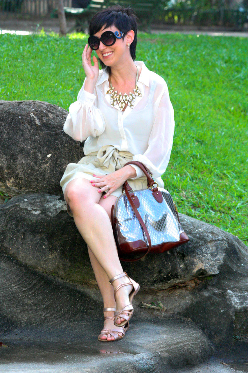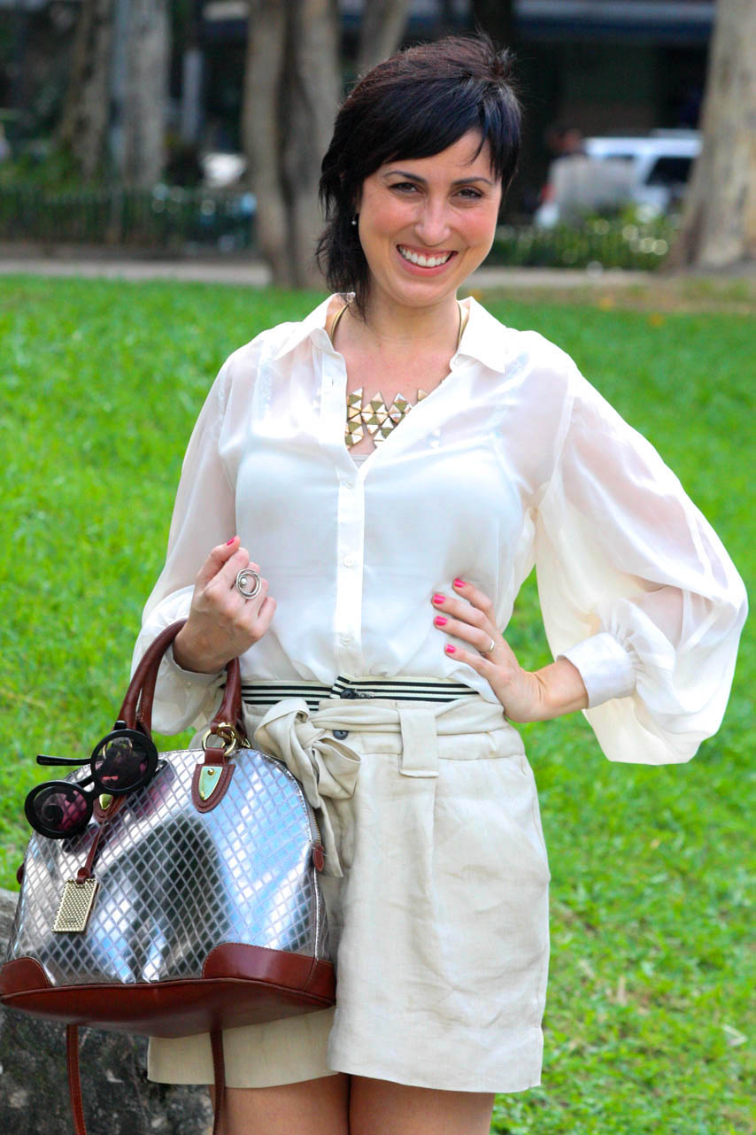 Aproveitando o tema camisa branca e tons claros, o bom de looks nessas cores é que a gente fica mais elegante sem fazer muita força, hehe! O segredo está em misturar tons como bege, branco, creme, off-white e texturas para não ficar parecendo da área de saúde. Outra ideia bacana é usar acessórios metalizados para modernizar o visual e pronto! 🙂 Vai dar a impressão que você levou horas se arrumando, rs!