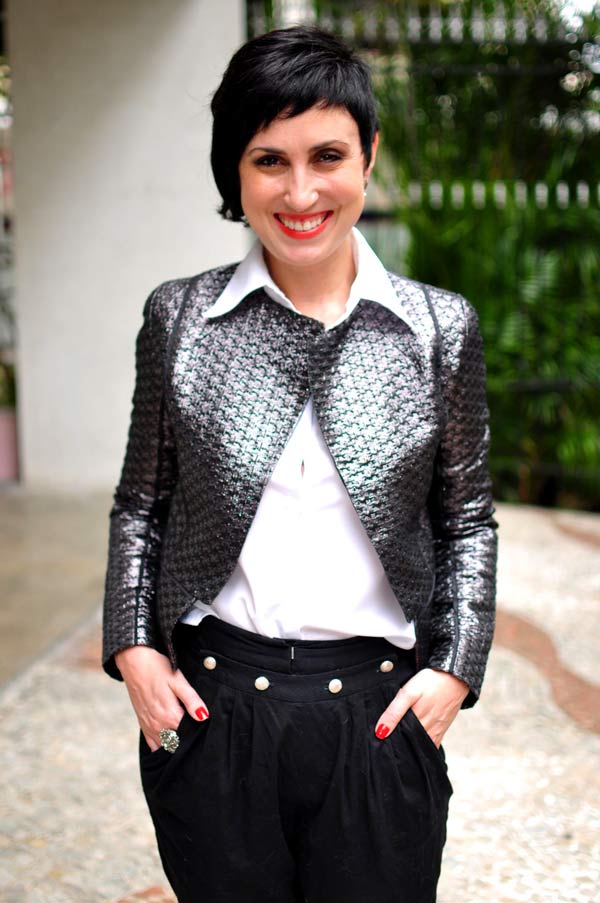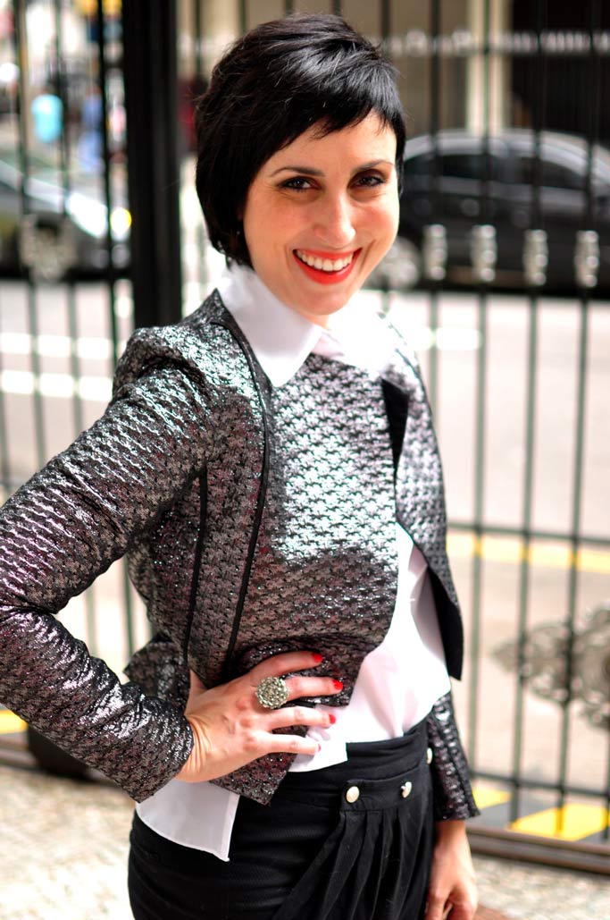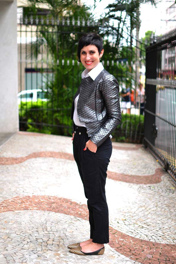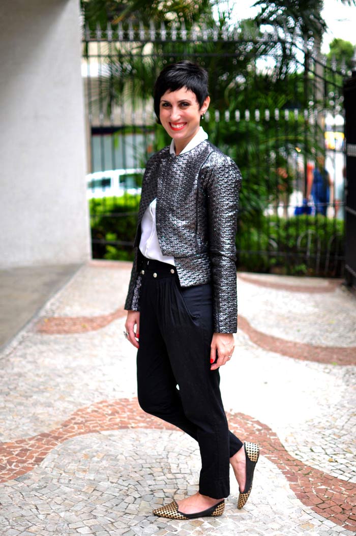 Ok, a jaqueta jeans foi planejada, algo que eu queria, percebi que faria a diferença no guarda-roupa. Essa também, mas para eventos festivos, rs. Ontem vi um look bem clássico no site da Garance Dore, fotógrafa e ilustradora francesa e me deu vontade de ficar um pouco clássica também: calça preta, camisa branca…e uma jaquetona brilhosa pra dar o tcham que eu tanto gosto! 🙂