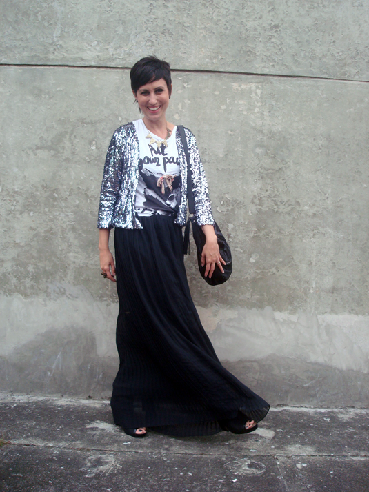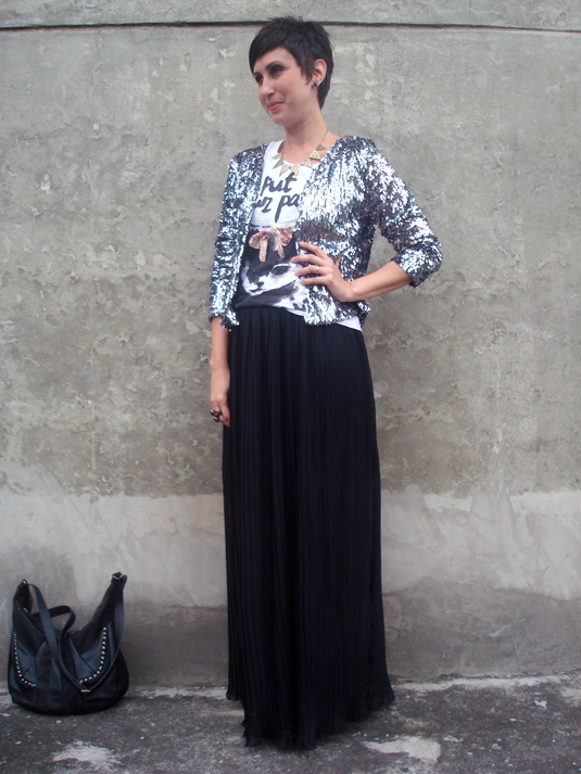 Estou louca para experimentar um look assim! Tenho a saia e a blusa bacana, só me falta o casaco de paetês… minha saia plissada aliás é uma história engraçada: ela é midi, e ganhei de presente há muuito tempo de uma tia avó muito querida e já falecida…na época nem dei muita bola para ela mas guardei porque tenho o hábito de não me desfazer de presentes de pessoas queridas 🙂 e hoje- veja só- a saia plissada está com tudo! E olha que tia Lourdes já tem uns 8 anos de falecida…era avant guarde a danada!!! rs,rs