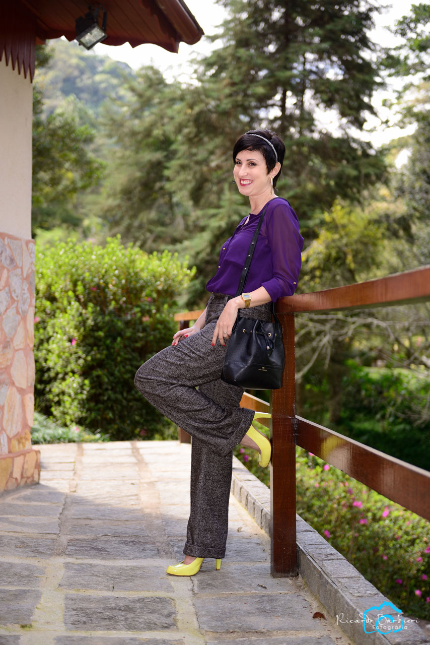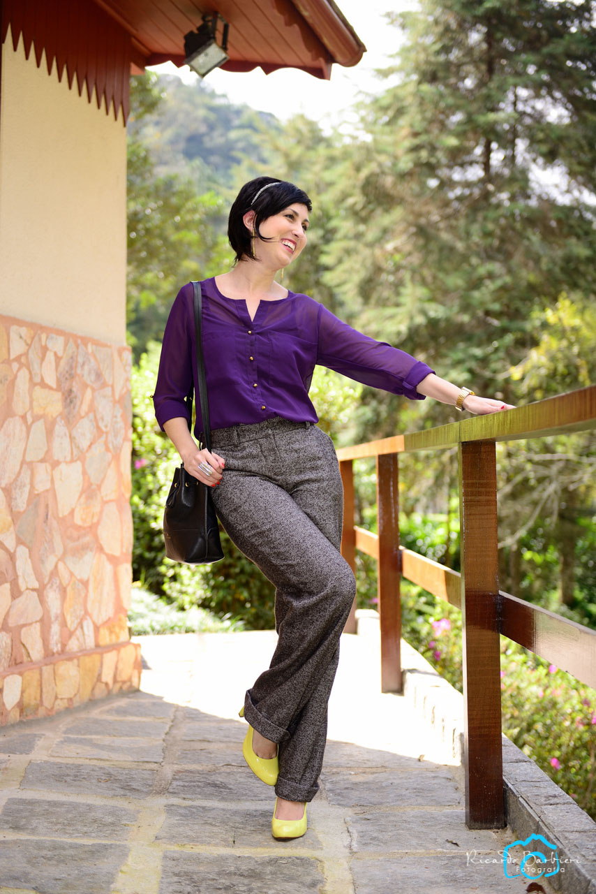 Tentei um look mais divertido, com um contraste interessante: amo brincar com roxo e amarelo! Mas eu mudaria algumas coisas: colocaria um cinto e trocaria a bolsa, no final senti falta desses detalhes.