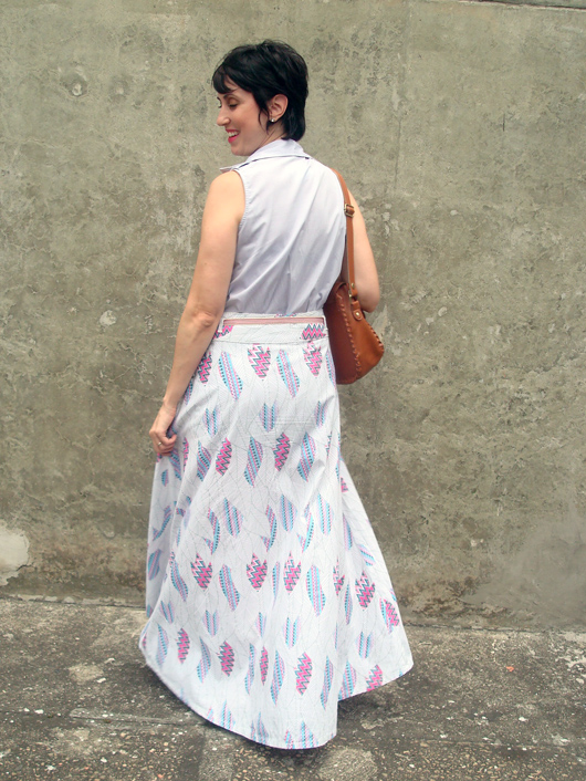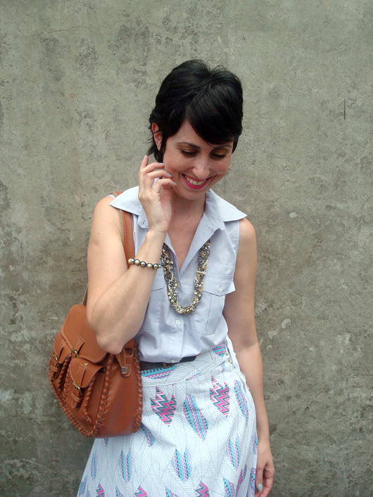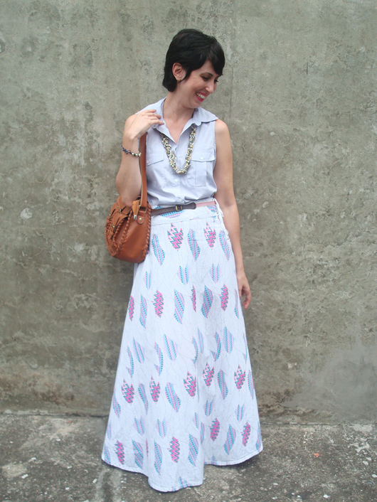 Ontem eu quis investir em um visual casual chic, hehe! E para isso, mais uma vez recorri a uma das minhas saias longas. Ficou um look bom para trabalhar e depois emendar em evento/happy hour! E olha a camisa sem mangas que eu falei nesse post dos Achados (e consegui arrematar na remarcação): mantém o jeito arrumadinho da camisa de botão, mas sem as mangas que me fazem morrer de calor nessa época do ano. E para justamente reforçar o chic que eu pretendia desde o início com a produção, um colar com muita pompa e circunstância. 🙂