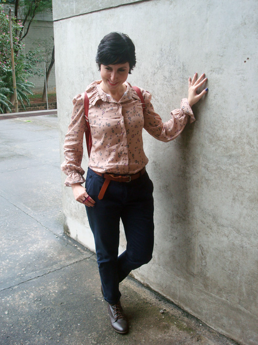 Ficou demais a blusa romantica antiguinha com as outras peças mais escuras e a bolsa vermelha, mano! Deu um ar meio rockn roll apesar de nao ser mto a sua praia ne…
