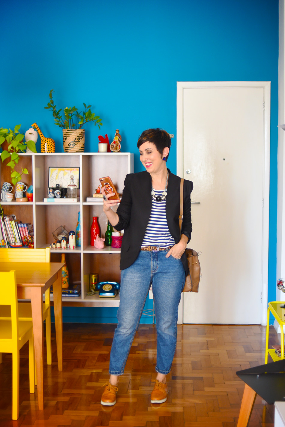 Também troquei o cinto de cor neutra por um com padronagem de onça – que também tem cores neutras, vejam vocês! Onças e listras são tão clássicas e curingas, galera. E num detalhe tão pequeno assim nem fica tão escalafobética assim a mistura. 🙂 Se o código de vestir da empresa for mais formal, troca a calça jeans por uma de alfaiataria!