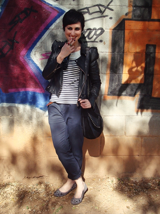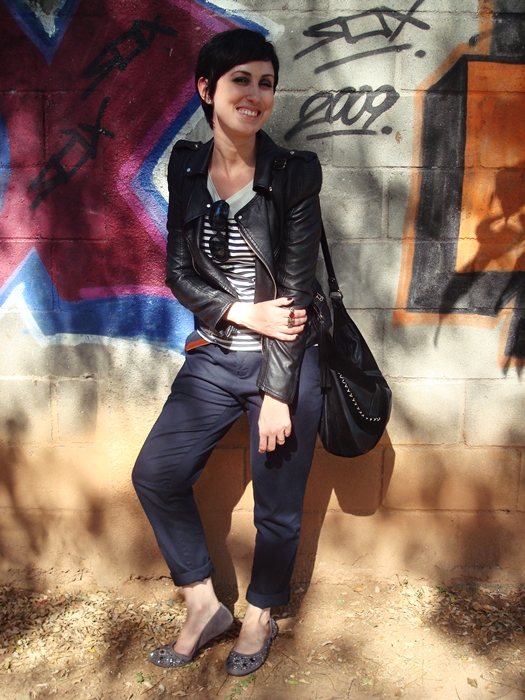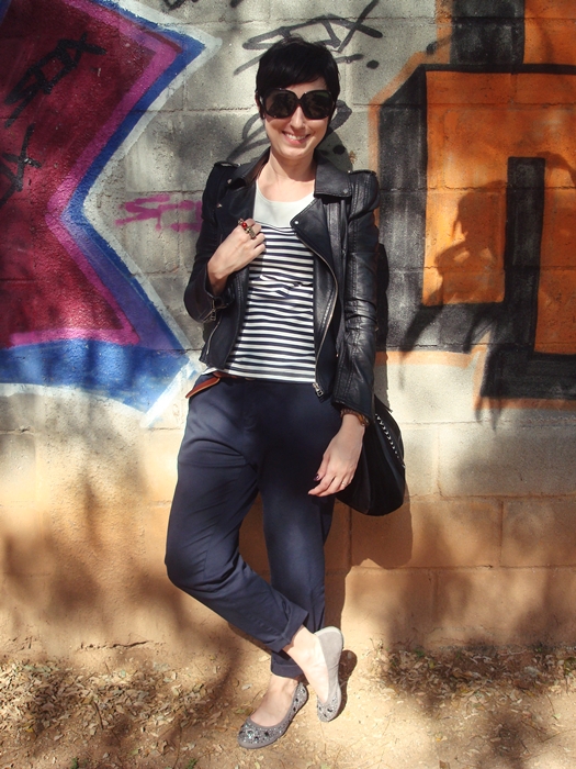 Sim, eu quase joguei a toalha pro look, cansada da semana, mas a minha meta é nunca deixar a dupla camiseta+calça ficar no básico: vamos então brincar de estilo navy? A cor da calç1234stampa da camisa deram o tom da produção temática e ainda garantiram meu conforto por conta da viagem, juntamente com a sapatilha. A minha amada jaqueta biker quebrou o marinheiro do look, numa uma mistura rocker interessante. Pena que morri de calor com ela…