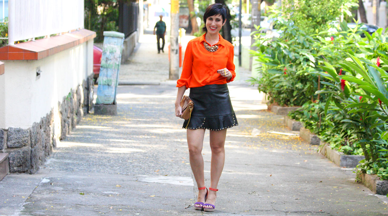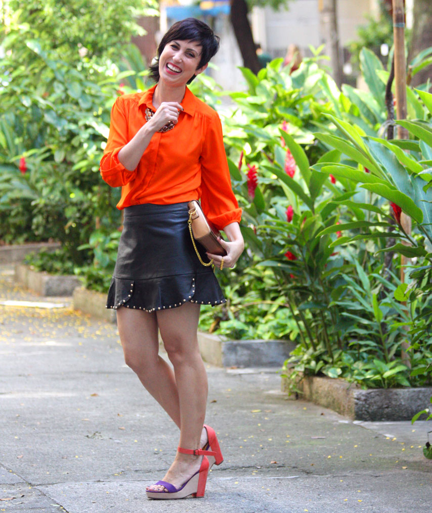 Aí desenterrei essa sainha do Ebay (total cópia da original da Zara que todo mundo tem, rs) e combinei com laranjão, bem alegre, bem contrastante! Como a saia é meio sensualizante (hahaha), eu tento usá-la com camisas ou t-shirts, para quebrar um pouco esse apelo sexy dela. Quero testá-la numa próxima vez com uma camisa ou t-shirt por cima, deixando só os babadinhos à mostra. É uma outra ideia, heim?