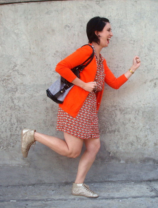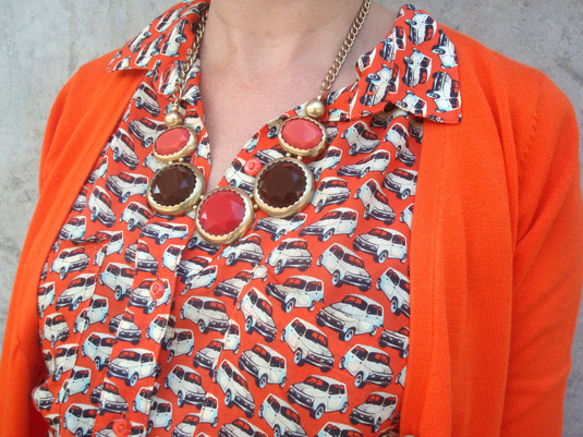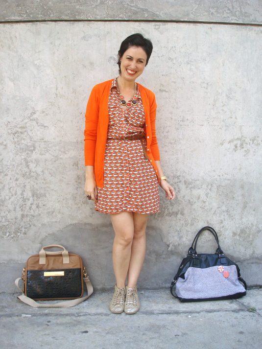 Pá! Quarta-feira de muuuuito trabalho, terminando de diagramar e fechando para a gráfica a revista de um cliente (sou designer gráfico, quem precisar de um é só chamar! *momento auto jabá*) . É tanta coisa em época de fechamento que eu mal consigo ter tempo para me olhar no espelho. Por isso optei mais uma vez pelo meu vestidinho com estampa de carrinhos, salvador de todas as situações e tênis para ficar confortável no meio dessa correria. E também mais uma vez o cardigan laranja entra na jogada! Hoje to só de cores bem vivas, para botar o astral lá pra cima! 🙂