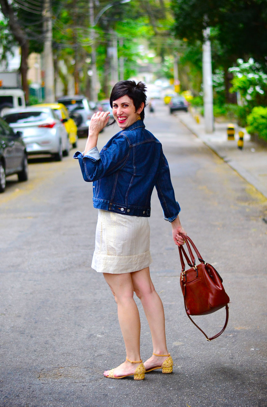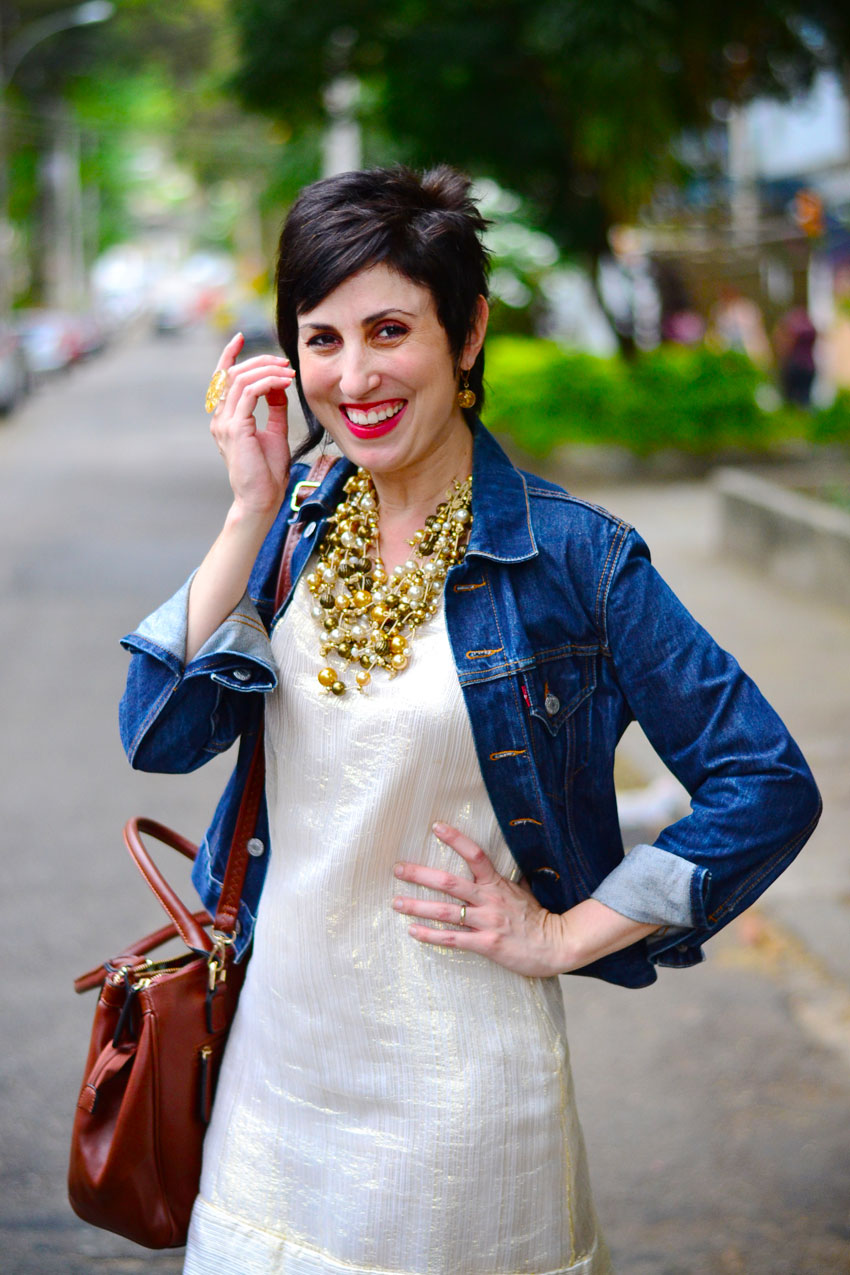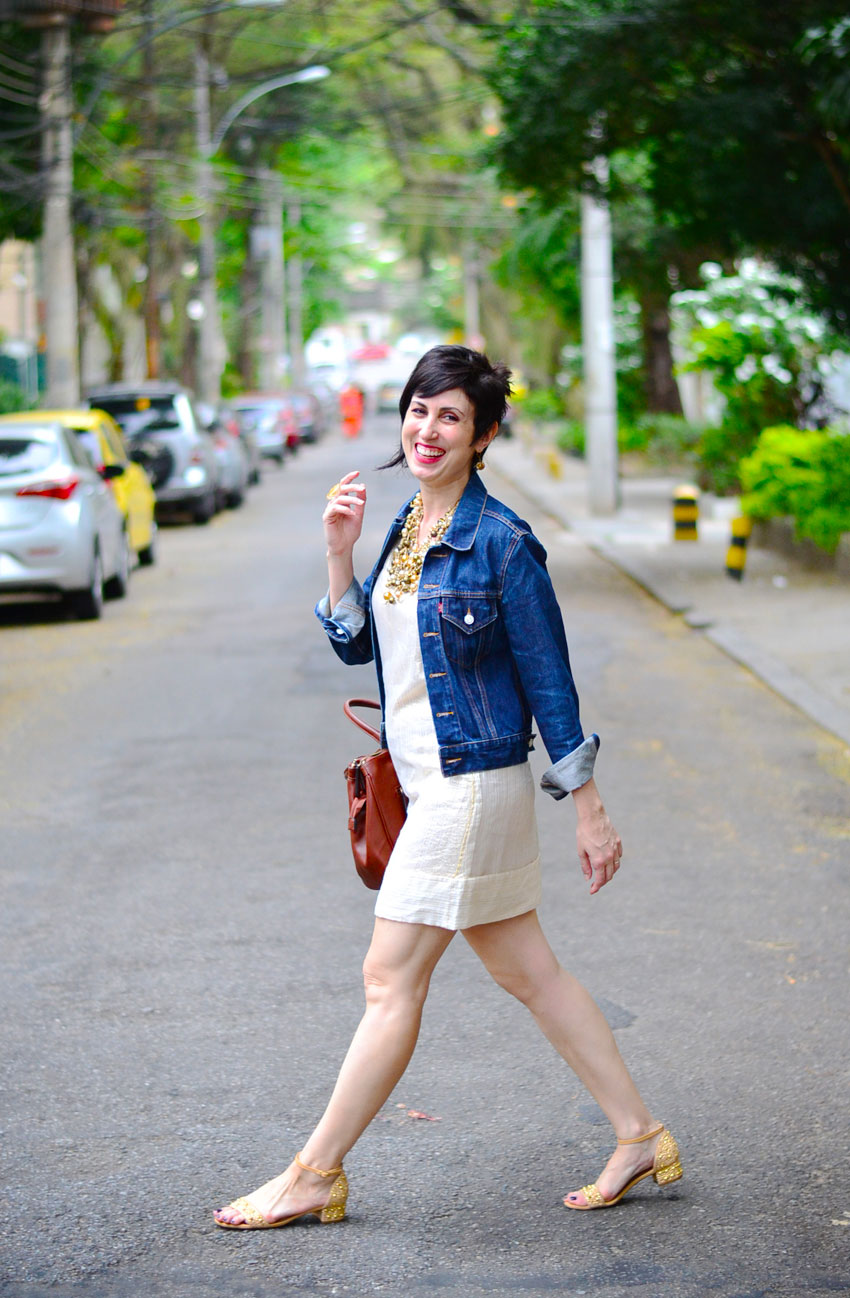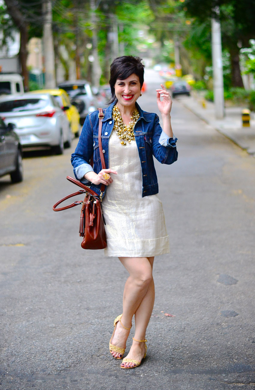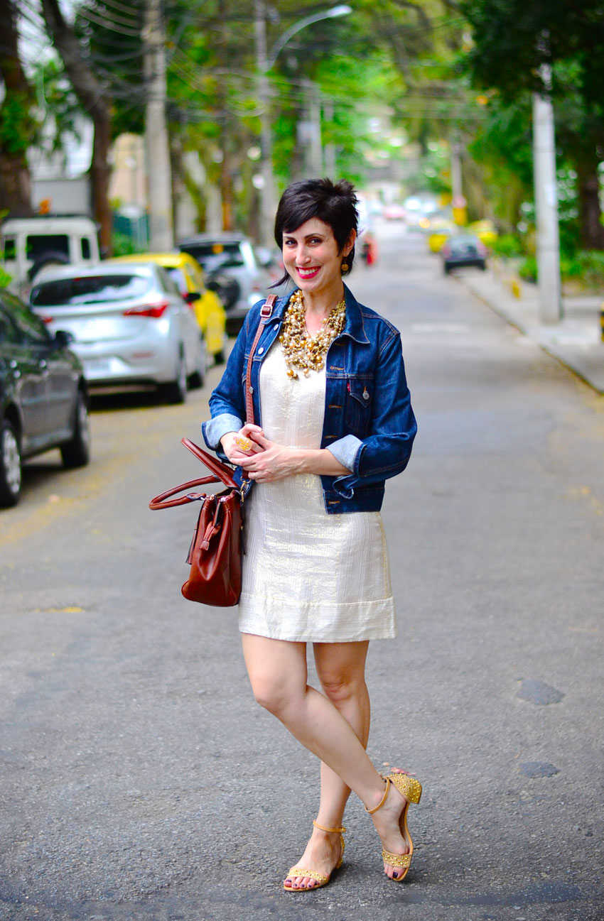Acho que essa semana também virou a chavinha e entrei no modo clean, porque j1234erceiro look todo em tons claros! Ontem vocês sentiram falta de um colorido, sinto dizer que hoje vocês também darão falta das cores, rs. Me empolguei pelo tom dos fios dourados do vestido e escolhi complementos que combinassem com esse detalhe brilhoso! E para equilibrar a mensagem de estilo que ele carrega e adequá-lo ao cotidiano mandei ver um elemento esportivo por cima: a minha curinga jaqueta jeans!