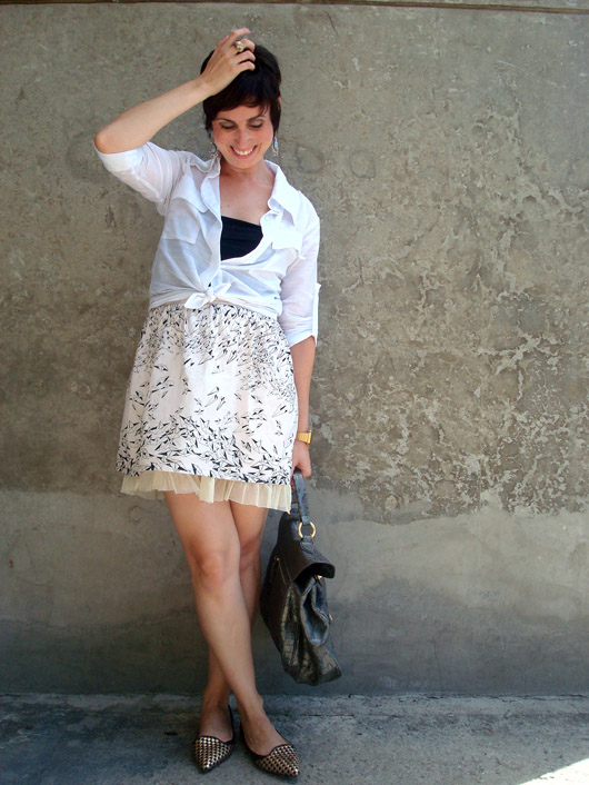 Desculpe-me, Ana, mas não consigo gostar de camisa amarrada. Só me lembro das camisas amarradas q eu usei na minha pré adolescência, em meados de 90. Fora isso, que eu até acho que deixa o look despojado demais e inapropriado pro trabalho, o restante é nota 10. Adorei o vestidinho (que eu achei q era saia e blusa, óbvio) e a estampa de barquinhos é divertida e fofa. Sorry não dar nota 10 pro look todo, acho que sou um pouco chata =)