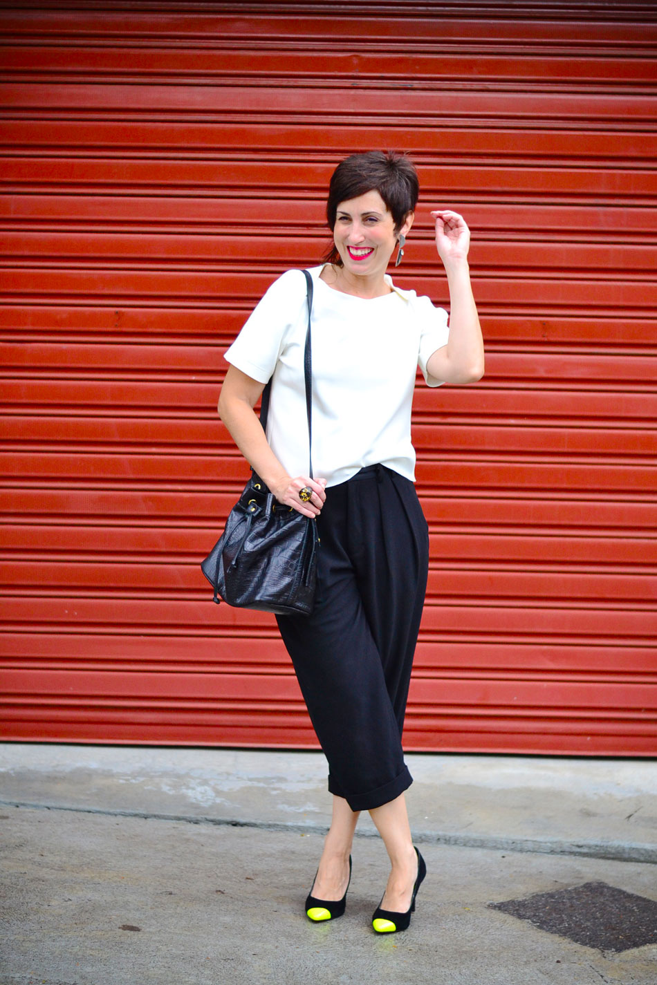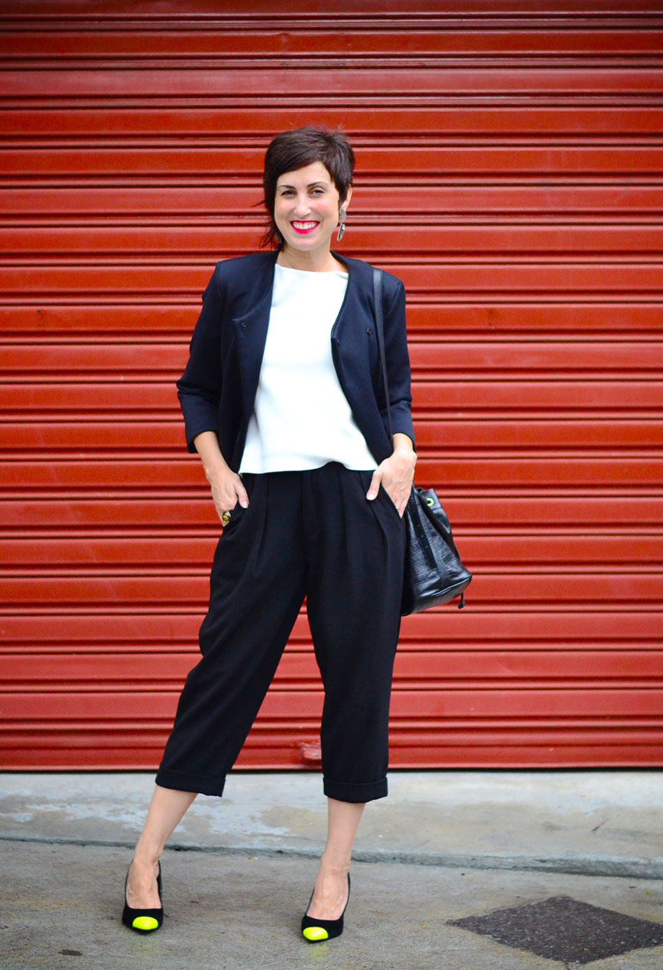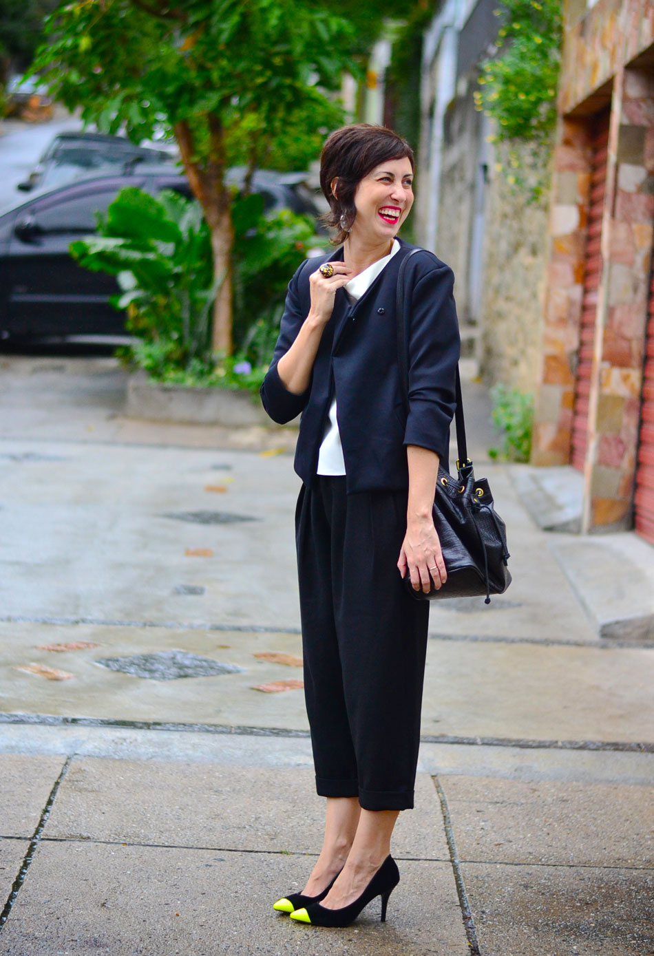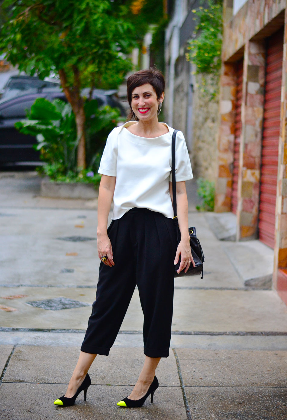 O que está pegando pro difícil é que mesmo mantendo meu estilo nos looks – esse de hoje tem alfaiataria moderna com a calça curta, blusa estruturada em neoprene e casaqueto também estruturado, além da diversão por conta do scarpin de biqueira neon – eu não tenho amado de paixão os looks. Assim, na hora eu gosto, mas vendo as fotos eu sinto falta de cor, sinto falta de acessórios (cadê um colar alongador nesse look de hoje?!), me sinto um pouco fora de quem eu sou na verdade.