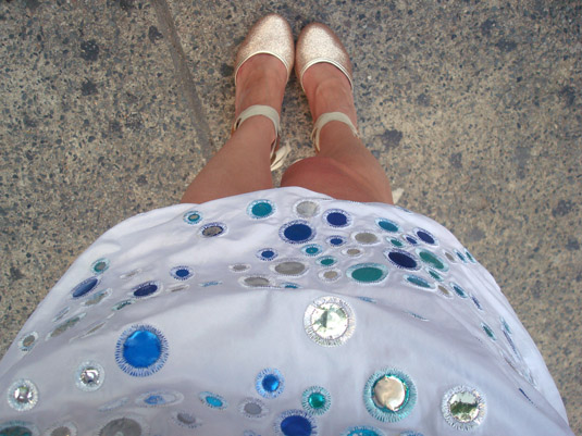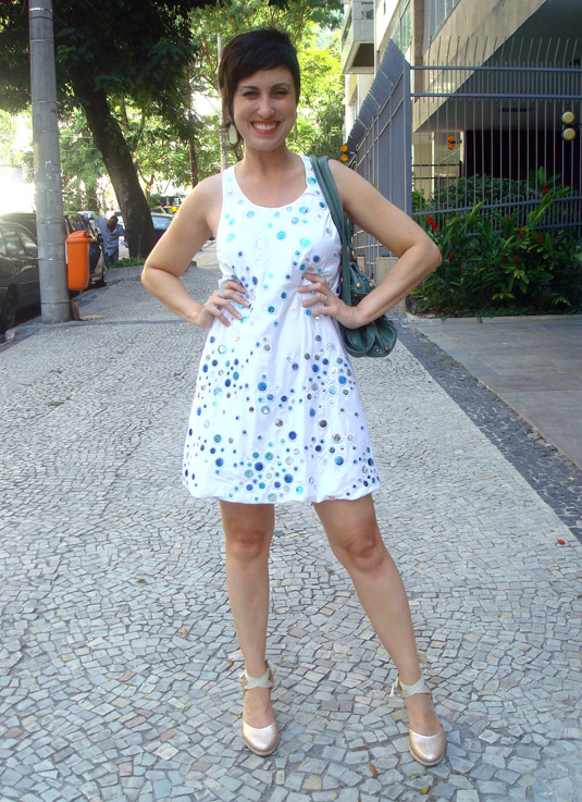 Eu tinha comprado esse vestido de segunda mão há tempos, mas depois me arrependi. Achei que não combinava comigo, que não fazia meu estilo. Hoje o vi com outros olhos, ainda mais no calor de 38 graus e resolvi dar uma chance a ele. Acho que estou também numa semana torta pra escolher acessórios, não consegui gostar de nenhum sapato pra combinar, só mesmo essa espadrile dourada. Mas no final acho que tudo deu certo e os brilhos das bolinhas do vestido com o dourado do sapato acabaram se entendendo. Ficou uma coisa meio ano-novo-feelings, mas deem um desconto pra essa blogueira que mal consegue abrir os olhos pras fotos, rs!