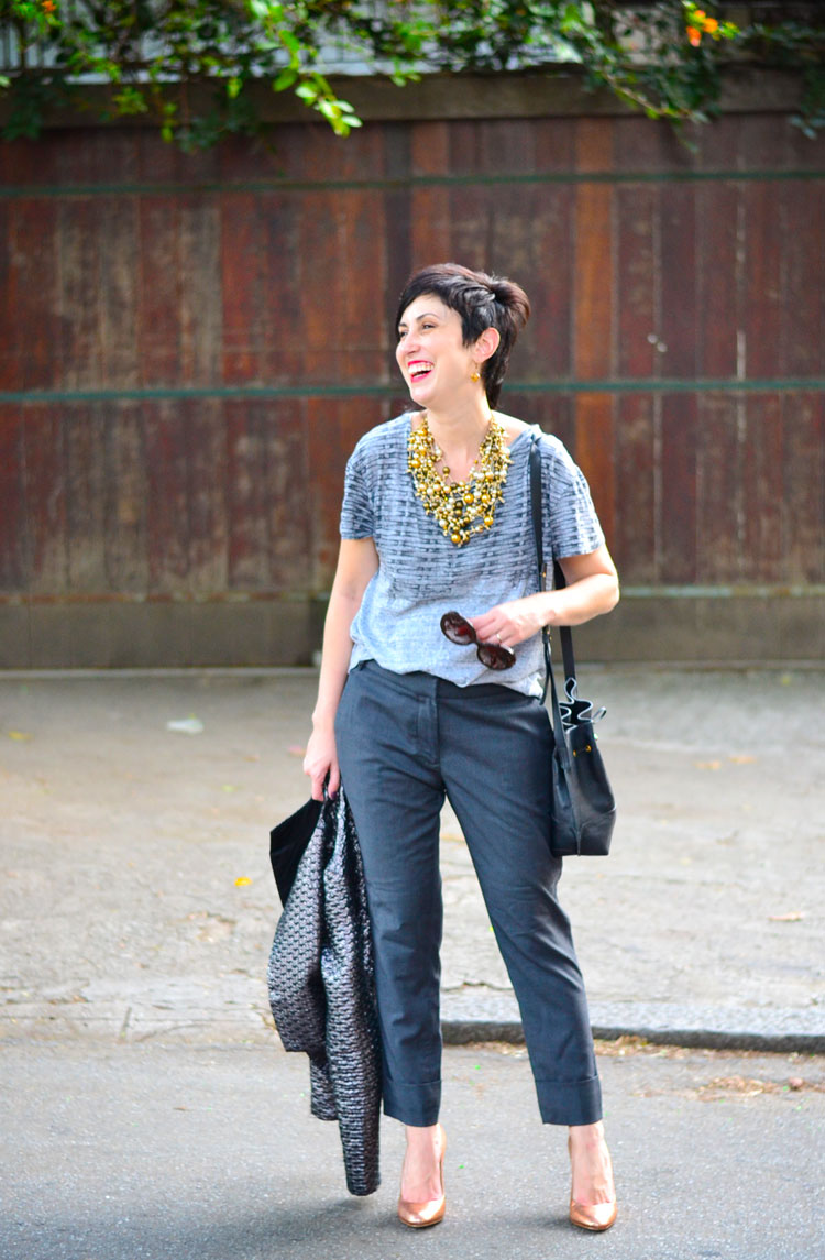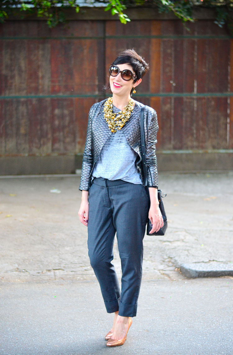 Usei esse look para dar meu workshop em SP na semana retrasada e fiquei tão apaixonada por ele que quis reproduzi-lo pro blog. Como eu tinha acabado de sair de um piripaque nas costas, eu usava uma cinta lombar e tênis para aguentar o tranco. Pensei logo no tênis com calça social, combinei assim e amei! Achei que se encaixava como uma luva na proposta do curso, que era falar sobre roupas profissionais adequadas à realidade de cada um.