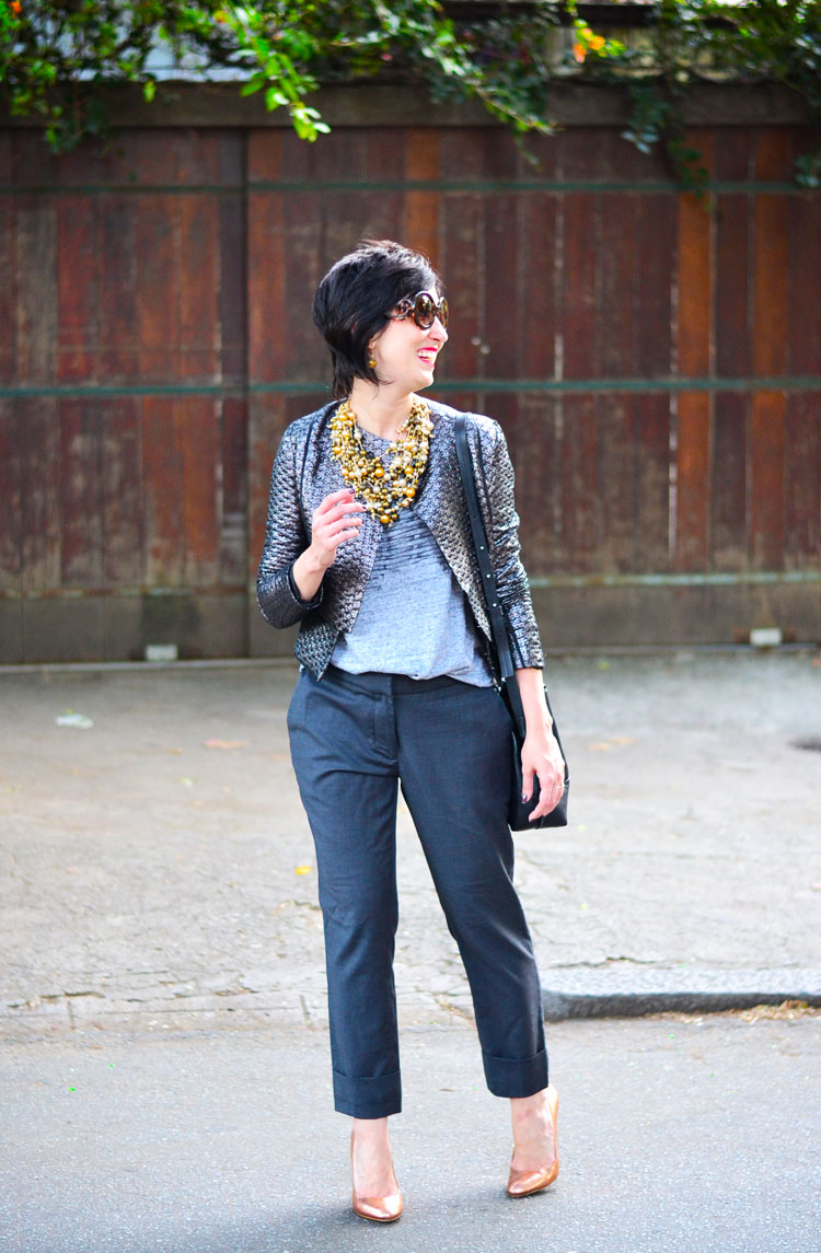 Um look todo trabalhado no cinza, mas em diferentes tons e texturas! Pra gente ver também que nem sempre looks monocromáticos precisam ser sem-graça, heim? 🙂