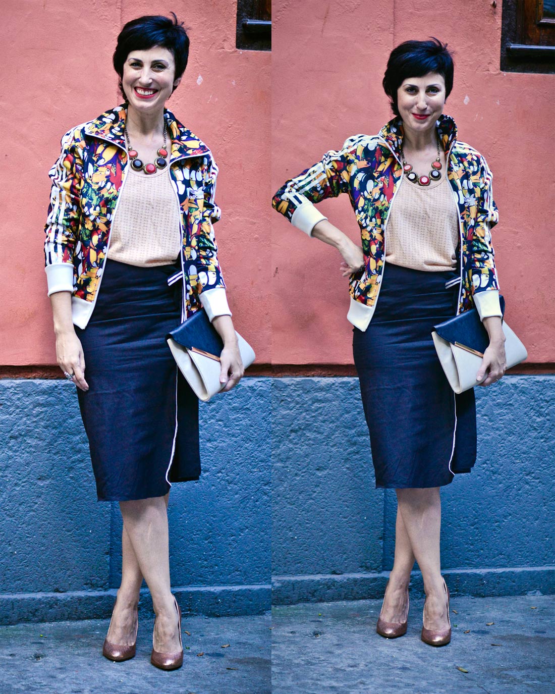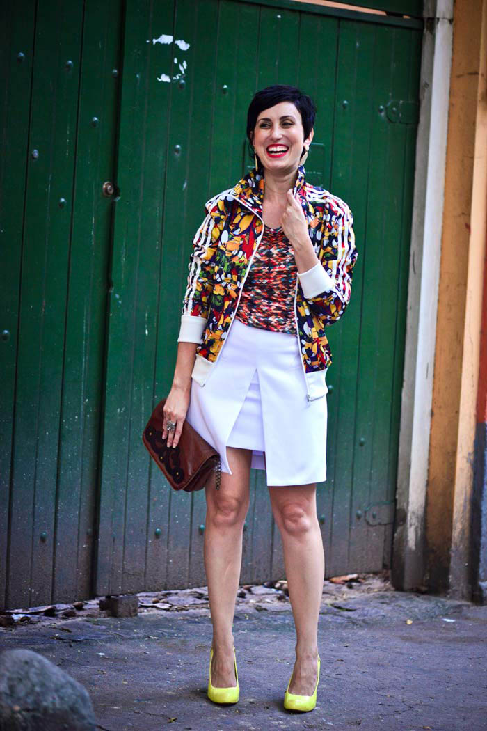 Já usei muita jaqueta esportiva, tenho um até hoje (lembram?) dessa época, mas que eu usava basicamente com camiseta e calça jeans. Então pensei: porque não colocar essa jaquetinha de estampa deslumbrante em um look mais incrementado? Uma mistura da alfaiataria esportiva? Bora!