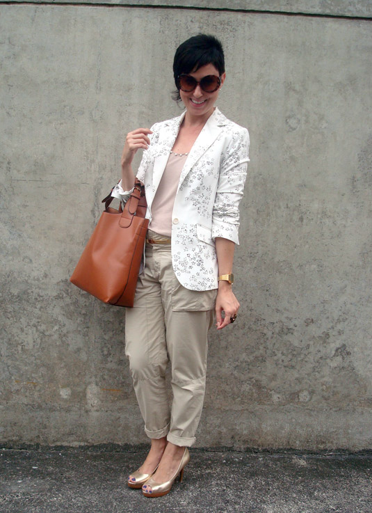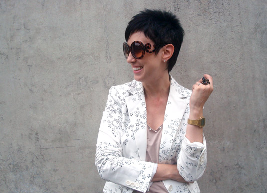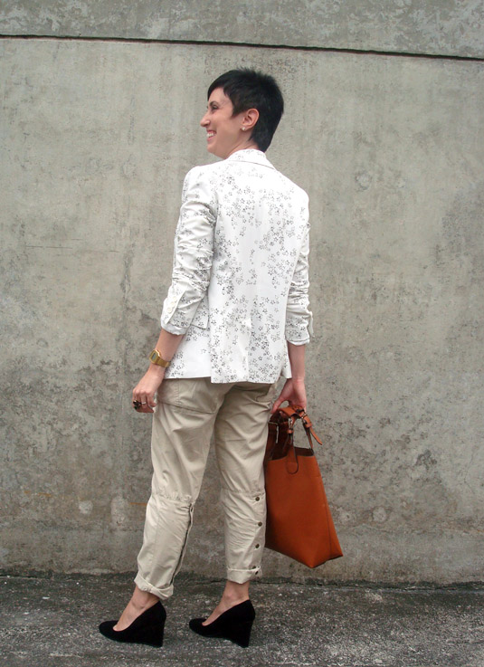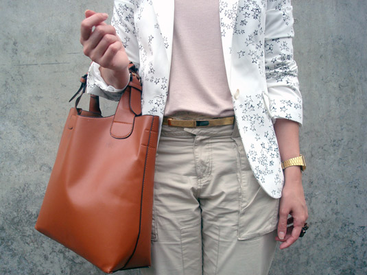 Primeiro: achei que o blazer ficou lindo (!!!) e que ele permite muitas combinações com cores, ao contrário do tradicional preto+branco. As estrelinhas são suaves, quase neutras, eu acho que ele vai bem por cima de vestidos, blusas e saias, até com shortinhos, enfim. O que não significa que não possa ser usado de um jeitão mais ‘nude’ como você fez.