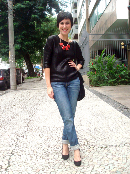 Esfriou um pouco por aqui e eu aproveitei para vestir esse tricô metalizado que minha amiga Érika trouxe de Barcelona! Na verdade é um look meio preguiçoso, daqueles que a gente não gasta nem 5 segundos pensando, haha, mas o brilho do tric1234axi colar acabaram dando o tchananan do visual. Simples e que causa um efeito bacana!