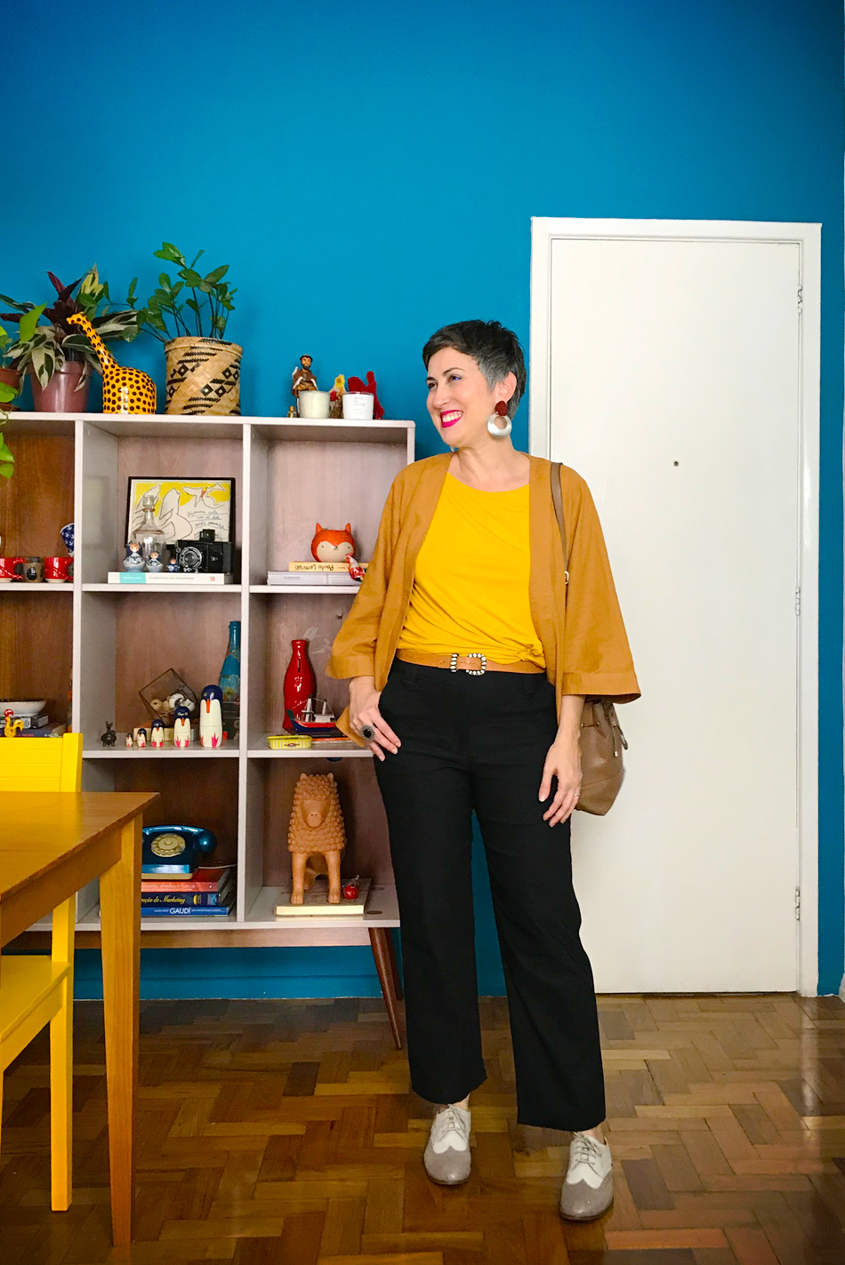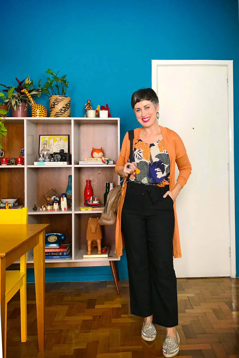 Uma coisa que fazemos demais é coordenar calça preta + blusas ou camisas estampadas coloridas. Acho um crime, juro! hahahaha! Preto com cores mais vibrantes matam a beleza da estampa, por isso eu uso alguns truques para melhorar isso. Um deles é coordenar com mais prças criativas no look, nesse caso foi o cardigan comprido alaranjado!