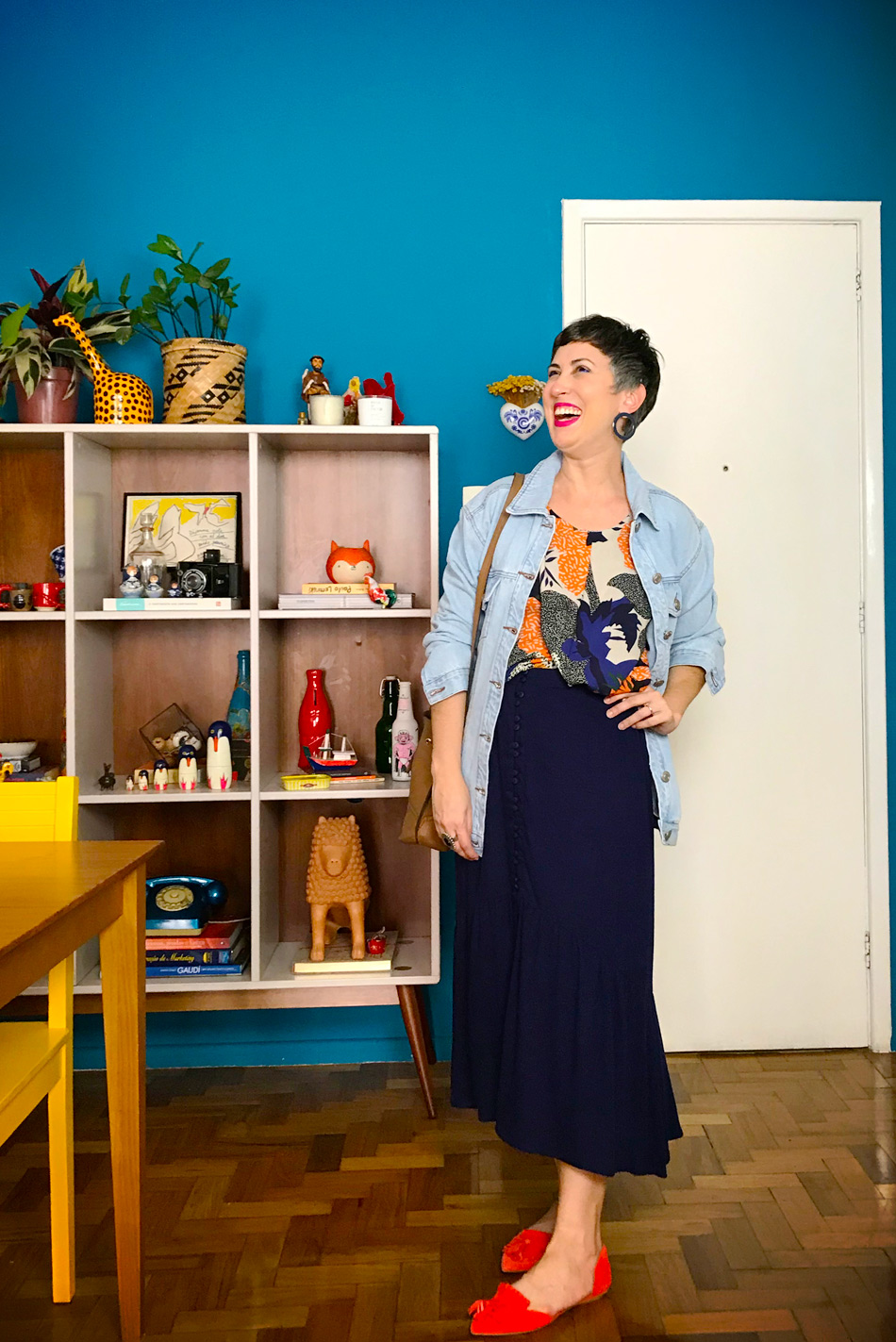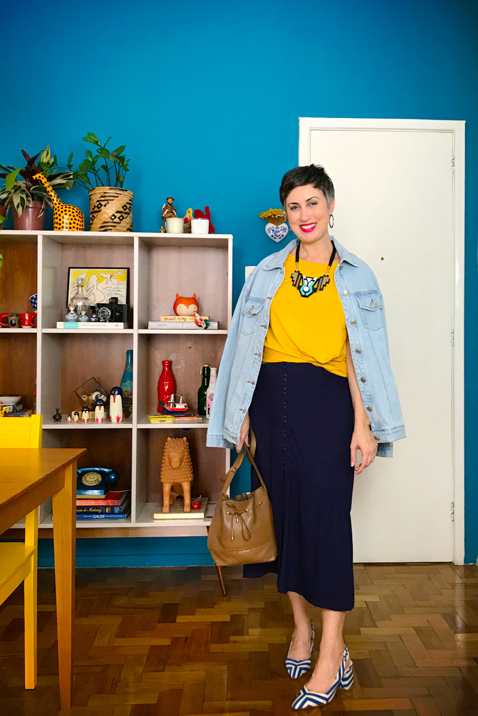 Quando a saia (essa é azul marinho) é mais comprida, gosto de trazer mais acessórios elegantes ou bem criativos e coloridos, para quebrar um pouco a sobriedade. A jaqueta jeans ajudou também nessa missão!