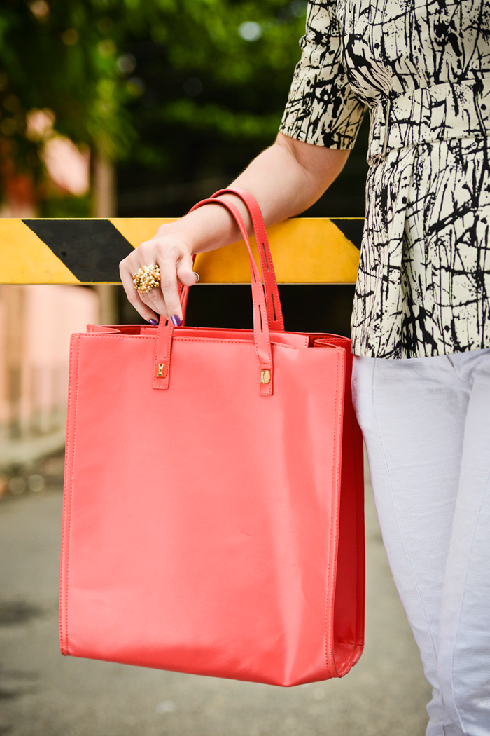 Ficou uma versão desse look aqui, não acham? A bolsa coral/melancia foi meu toque “Ana” de cor, hahah, porque não aguento tanto PB e neutro assim de uma vez, rs! Tirando a blusa, a calça já tenho há um ano, a bolsa eu comprei com um vale de 150 reais que ganhei de natal da Marisa – não precisei comprar que nem louca pra montar esse look! E é importante frisar que fui de sapatilha, porque eu super acho que a gente pode e deve ser feminina sem salto alto, além de ter uma galera que se desloca de metrô e ônibus. 😉