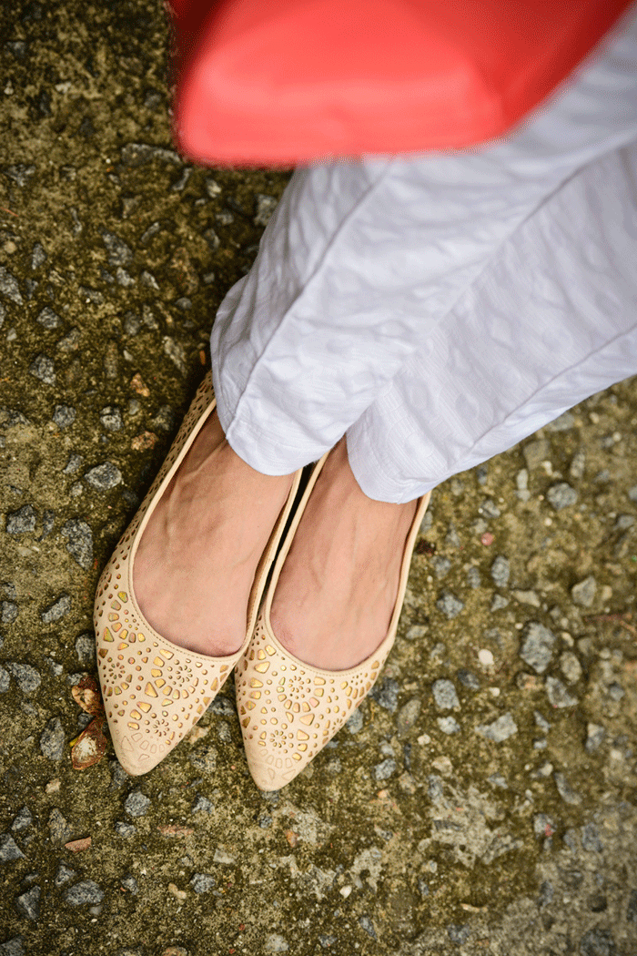 Ana… Ana… Sempre me fazendo repensar coisas entranhadas na nossa cabelça. NUNCA NA MINHA VIDA pensaria em misturar essa blusa (que não tem o tom branco que nem o da calça) com essa calça branquinhaaaaa, branquinha e com sapatilha nude.
