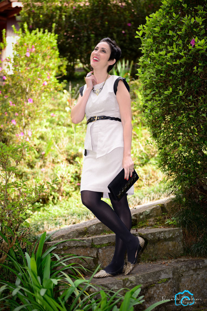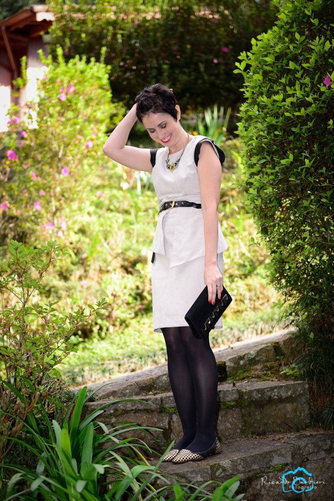 O look não levou praticamente nenhum ponto de cor mais colorida, mas também não achei sóbrio demais justamente pela modelagem do vestido. 🙂 Gosto também dos ombros trabalhados que super ajudam na harmonia da minha silhueta!