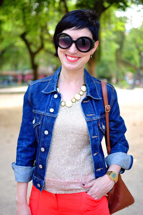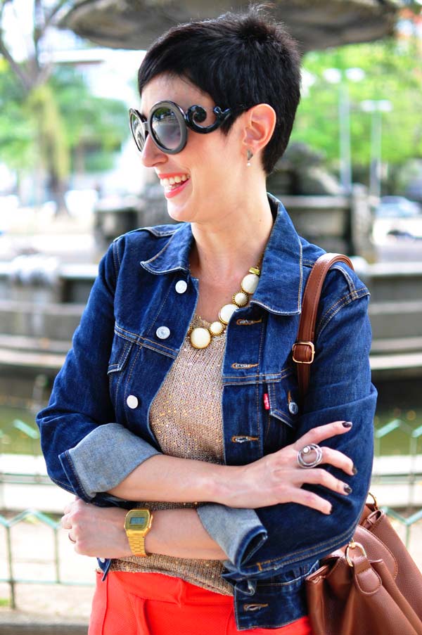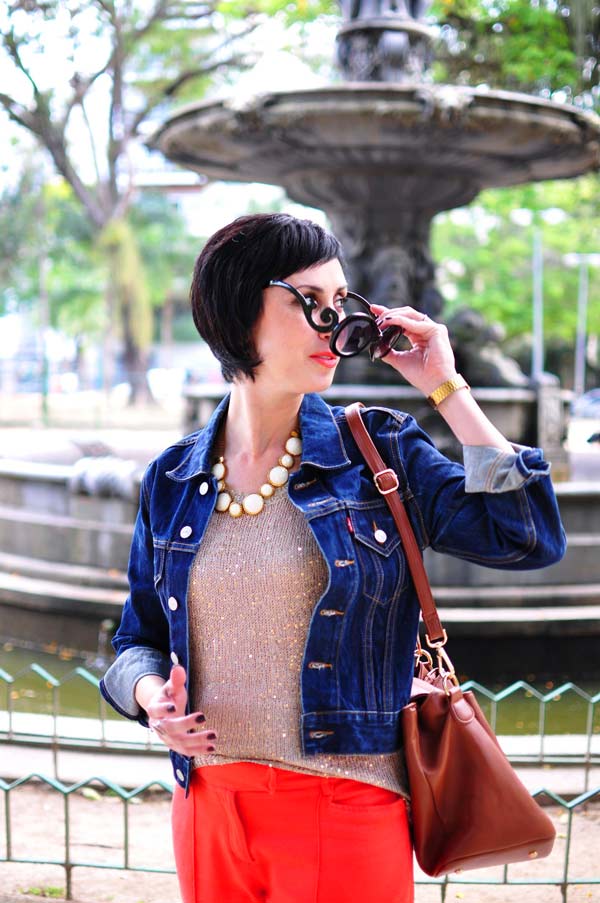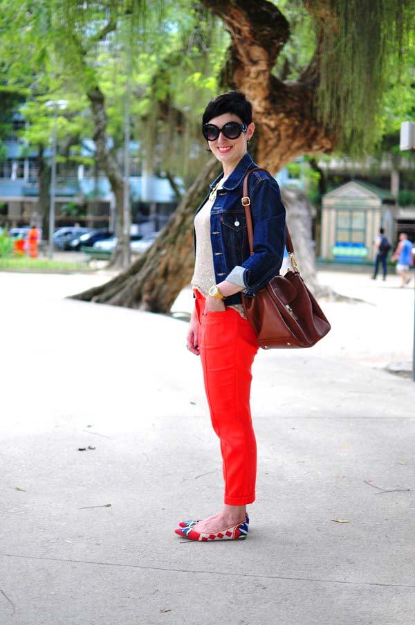 Tenho uma calça laranja e já a usei com jaqueta jeans (mas com uma camiseta cinza/mescla)!