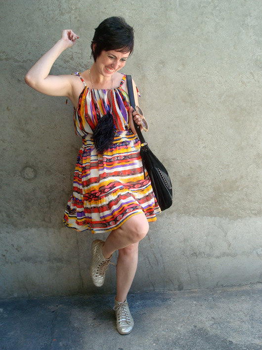 Ontem não teve jeito, o calor aliado à pressa me fizeram optar pelo vestidinho. Explico: nessa correria eu imaginei um look mas não tive tempo de testá-lo. Daí, quando fui me arrumar, já atrasada pro Fashion Rio, coloquei a roupa e…ficou horrível! hahahaha! Em menos de 5 minutos eu improvisei outro. E como eu adoro usar roupa nova, hehe, peguei esse vestido super fresquinho que também arrematei na liqui (a estampa é parecida com a da saia de ontem!), lembrei desse colar, que eu só havia conseguido usar 2 vezes e experimentei. Caiu como uma luva na produção! E tênis pra bater perna e enfrentar fila com classe, já que fiquei de tarde até final da noite no Pier.