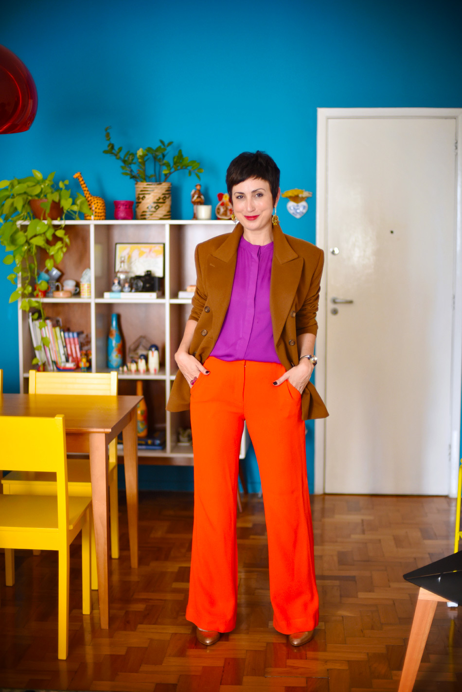 Acho um desafio propor coordenações de cores pois sei que ficamos inibidos com o impacto disso no dia a dia, principalmente quando avistamos a maioria das pessoas de cinza, preto e branco. Mas acho também uma lástima brincarmos pouco com o que nosso armário pode oferecer por conta de olhares de pessoas que na verdade não estão nem aí pra gente, só querem que fiquemos dentro da caixinha junto delas, amedrontados sei lá com o que.
