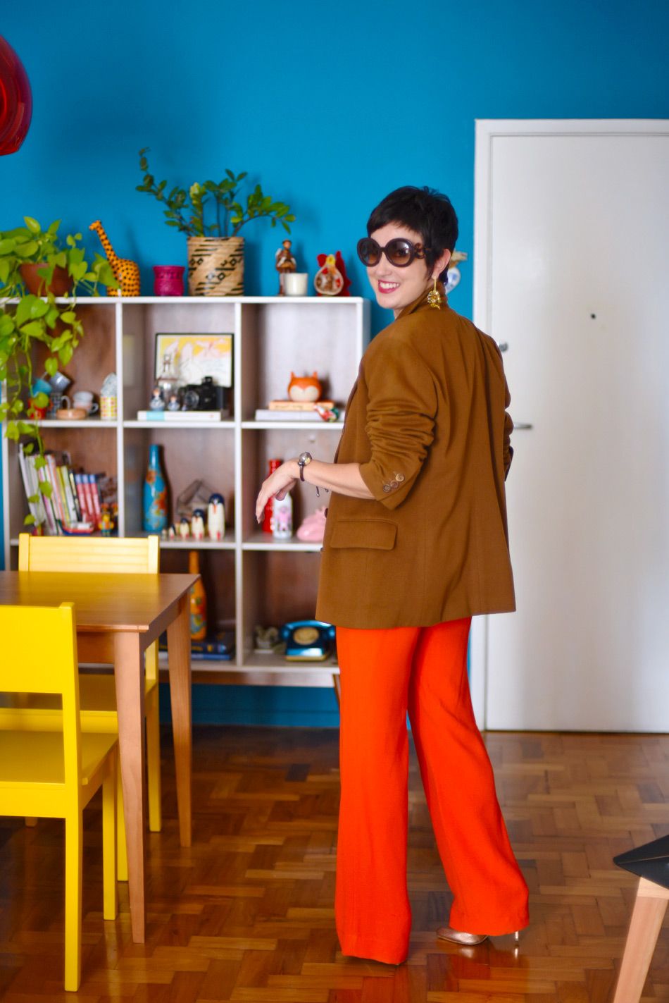 O look traz uma coordenação de cores análogas, que são cores vizinhas do círculo cromático, logo, têm pigmentos próximos e funcionam quando combinadas. Por cima colocamos meu novo queridinho do armário, um Jil Sanders garimpado em brechó (já falei que amo brechós hoje?), todo de cashmere (raridade!) e num tom castanha, que é um neutro colorido (expliquei sobre neutros nesse post), que é basicamente uma cor híbrida, que vai com todas as outras.