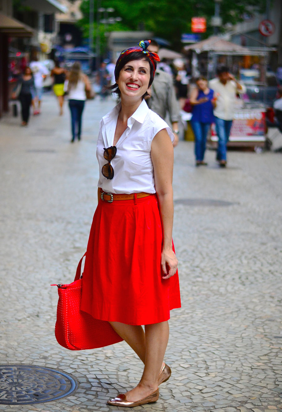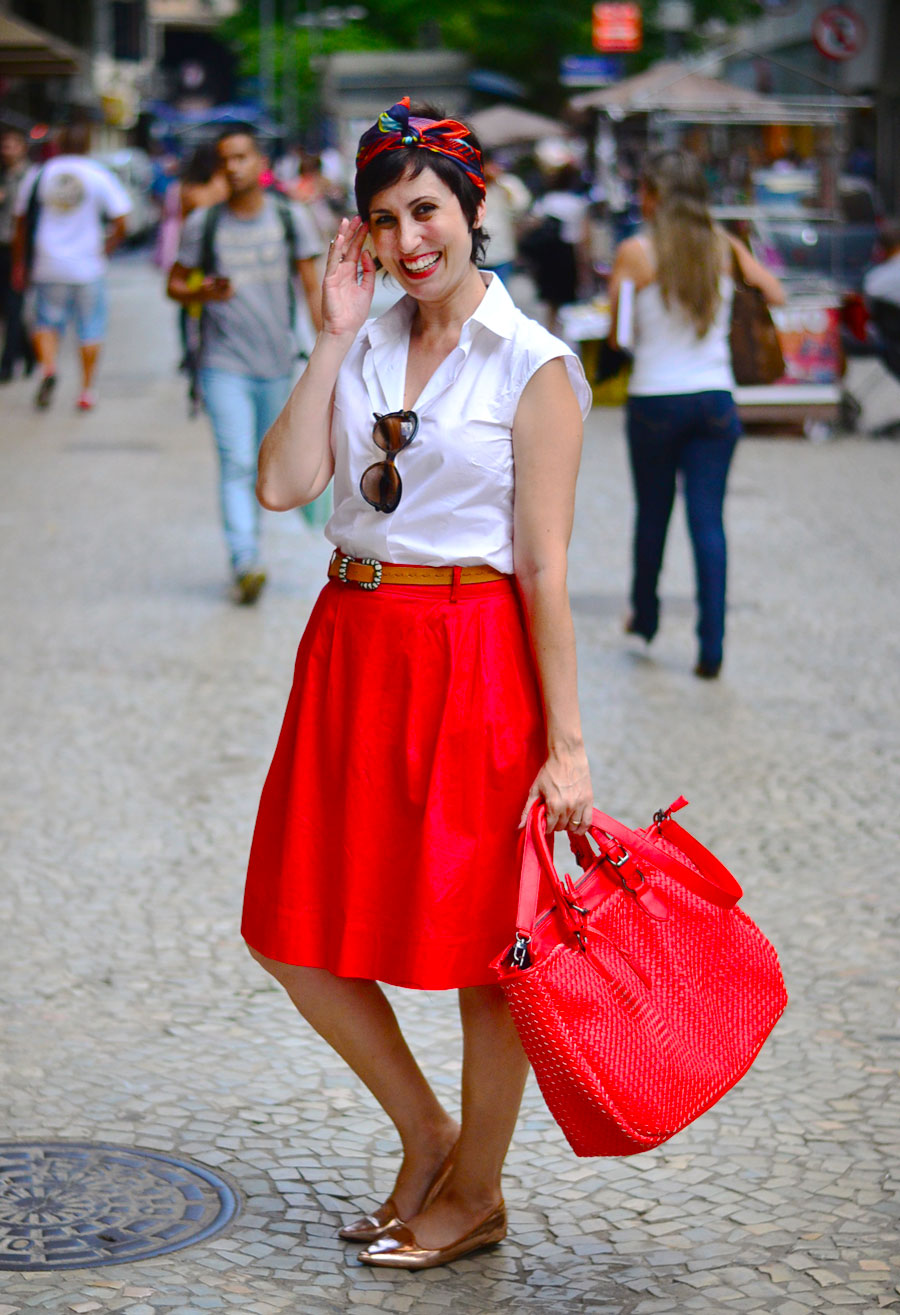 Sim, mais uma vez bolsa vermelha combinada com saia vermelha! Eu juro que tentei mudar, mas essa era ideal para eu levar a câmera sem pesar muito nos ombros e ainda dar uma disfarçada nela no Centro do Rio – essa câmera das fotos é um trambolhão, infelizmente. E aí, galera, vida real é isso: praticidade!