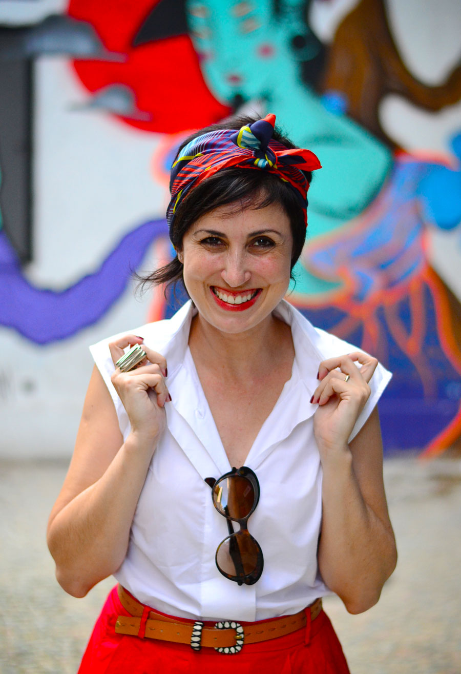 Apesar da irritação inicial acho que fui até bem sucedida na tarefa de montar um look ao menos interessante nesse calor! O que vocês acharam? Adorei o visual meio cinquentinha! Curtiram o lenço? Hehe! 😀