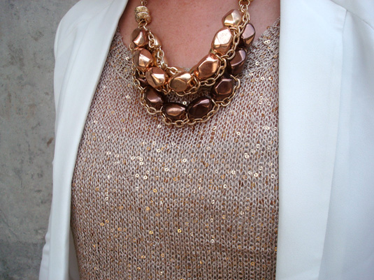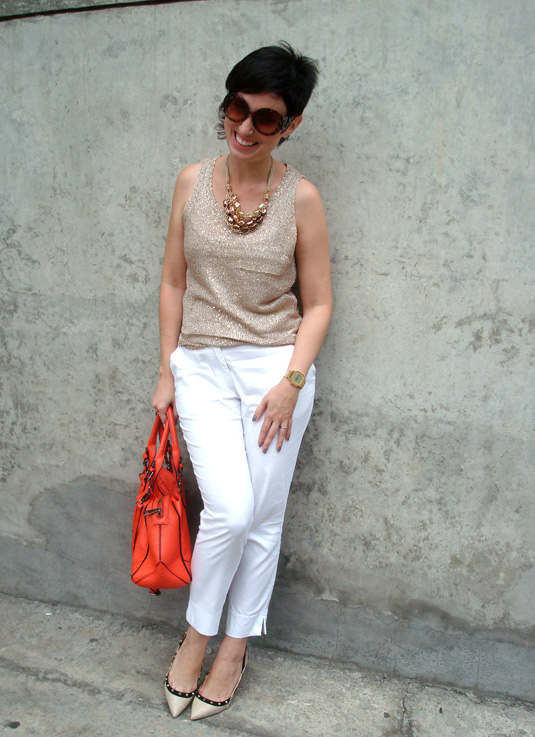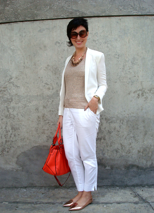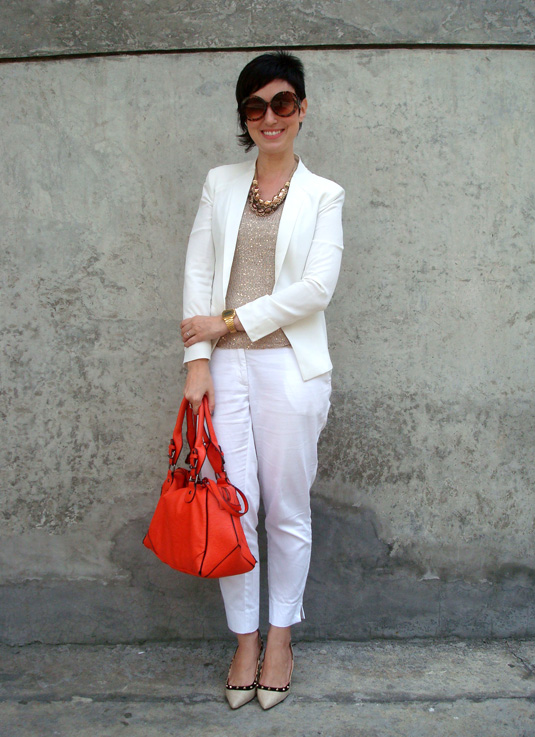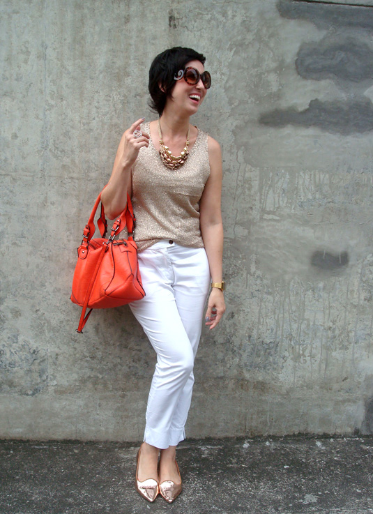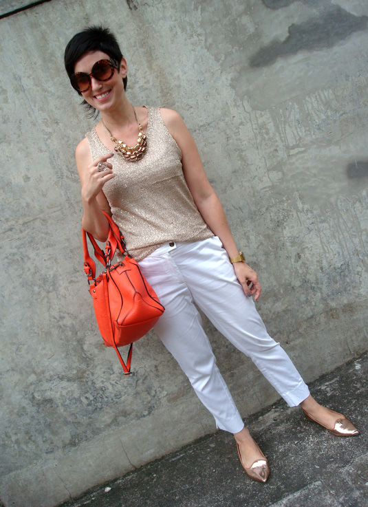 Um breve comentário sobre o look Carminha feelings (RIP Avenida Brasil!): eu estava em um clima rhyqueza, por isso experimentei um look todo branco com detalhes em dourado e bronze (e um laranjão na bolsa!). Mas acho que preferi sem o blazer, ou de repente com o blazer e uma calça jeans, porque tudo branco me incomodou um pouco. De qualquer maneira vocês podem reparar que já estou calçando um sapato da coleção fast fashion da SL! Hehe!