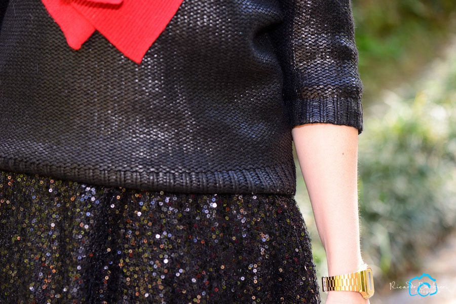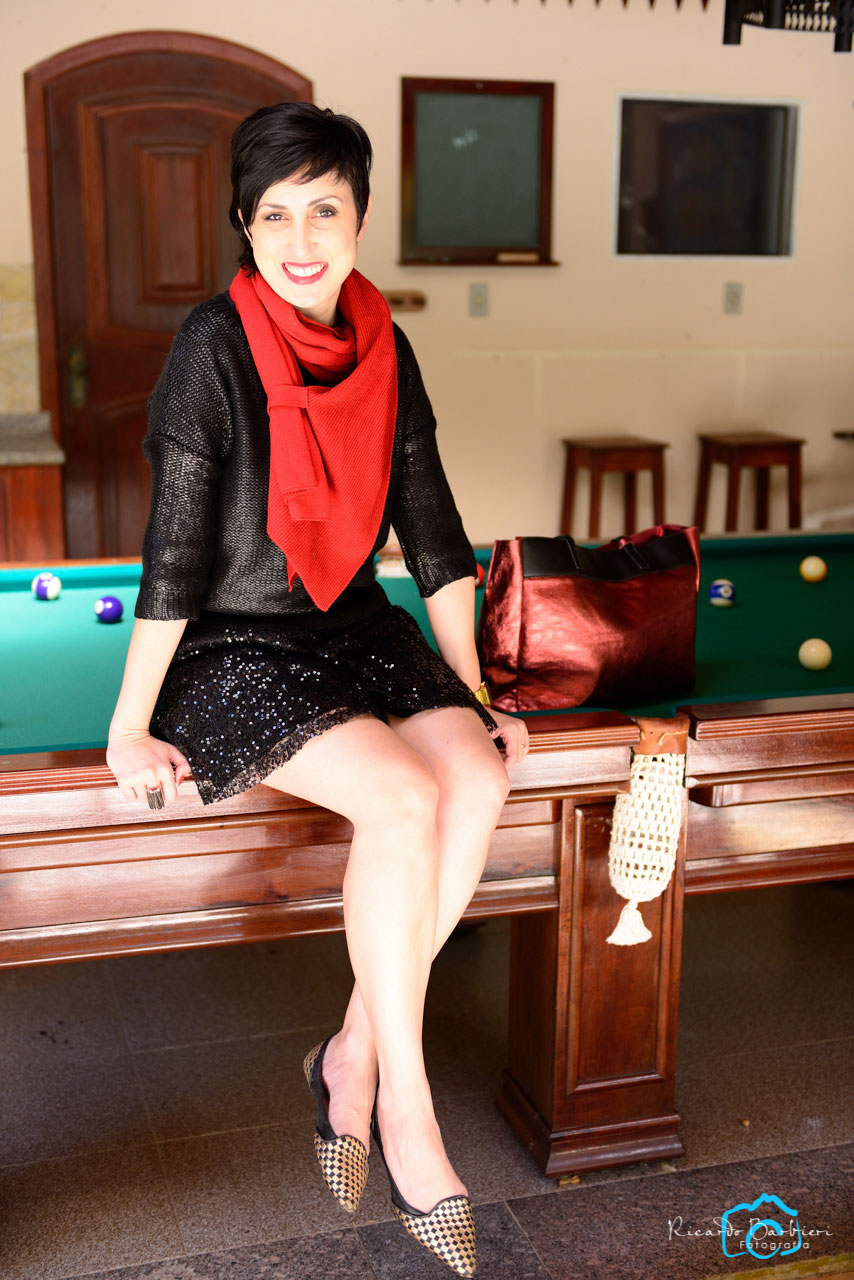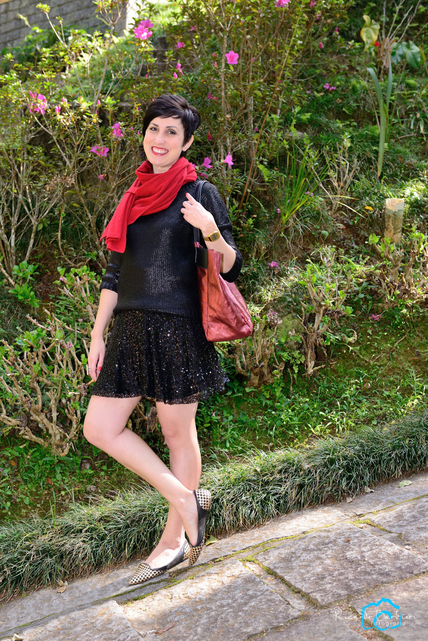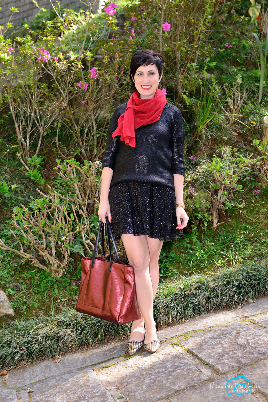 tricô preto com brilho, mini saia de paetês, cachecol vermelho, bolsa metalizada vermelha, sapatilha de bico fino dourada e preta