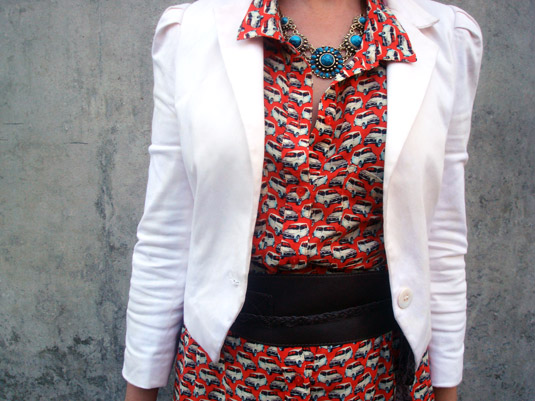 Acho esse vestido muito amor!!!! Mas achei o cinto um pouco pesado pra ele, talvez sem o casaco e com um sapato também pesado combine, mas com a sapatilha e o casaco fiquei com a impressão que um cinto mais “levinho” – talvez amarelo – ia casar melhor