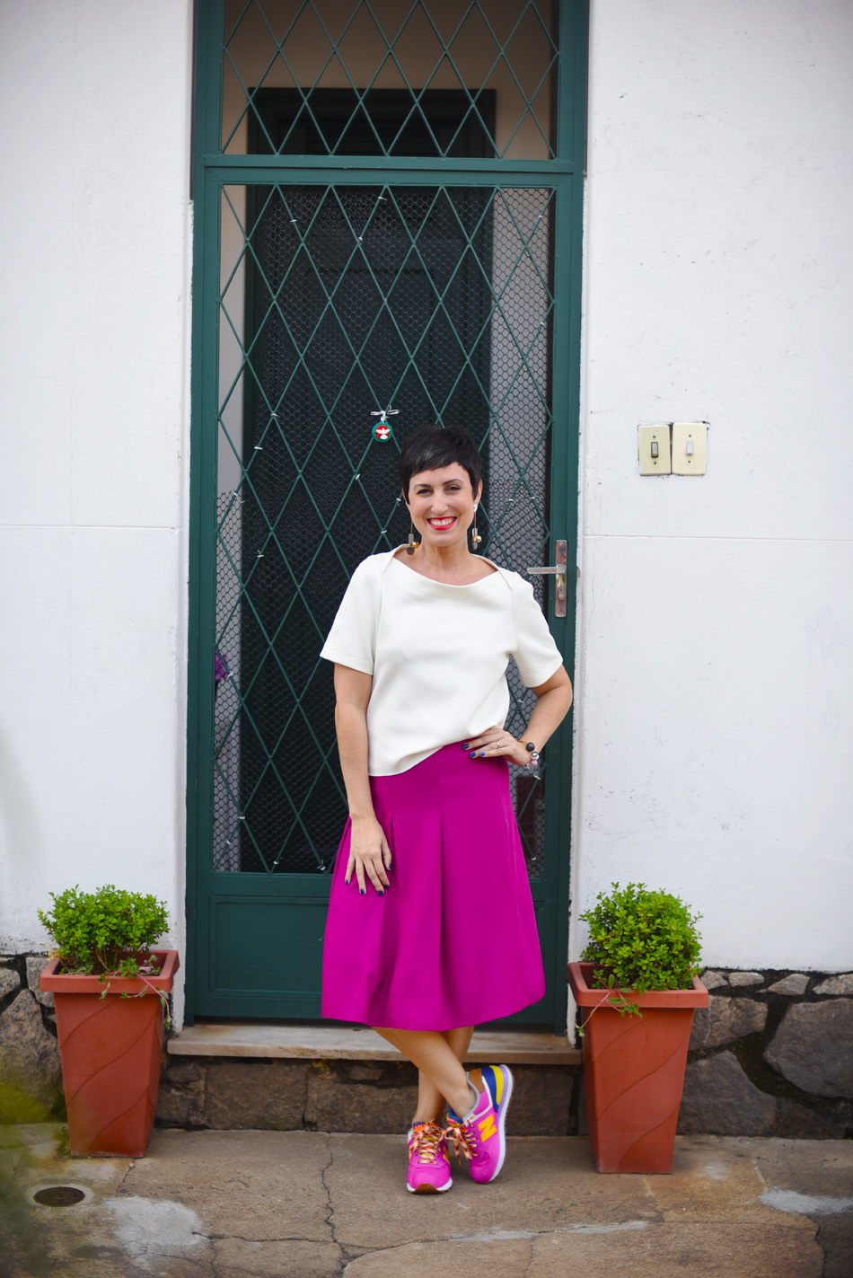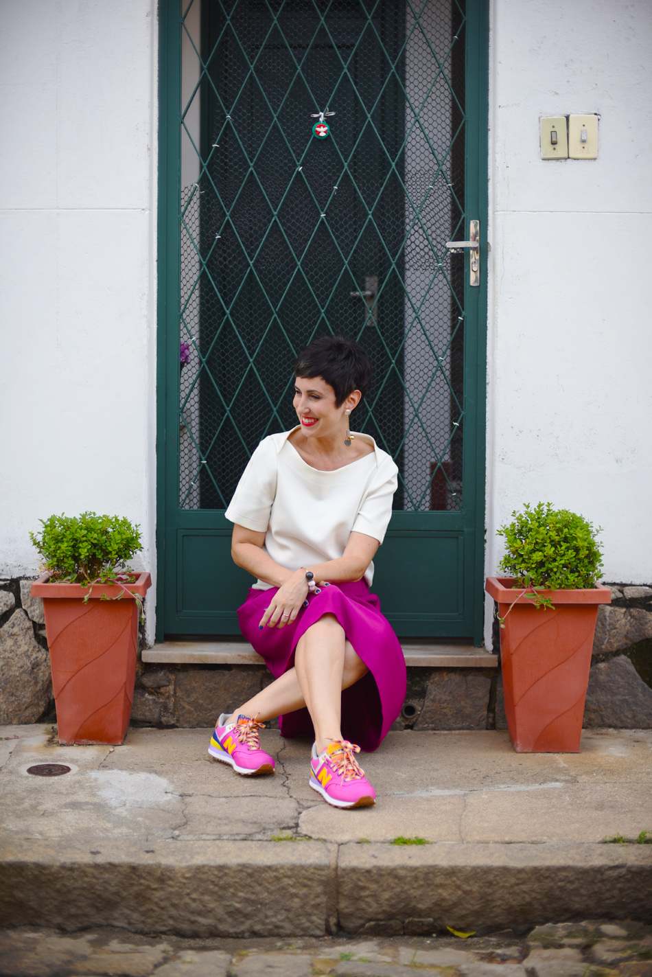 Usei esse look pra trabalhar e já mandei esse link na composição da saia de tecido plano com o tênis da mesma cor. Não fiquei arrumadona demais, nem esportiva pra caramba, sentiram o equilíbrio? 🙂