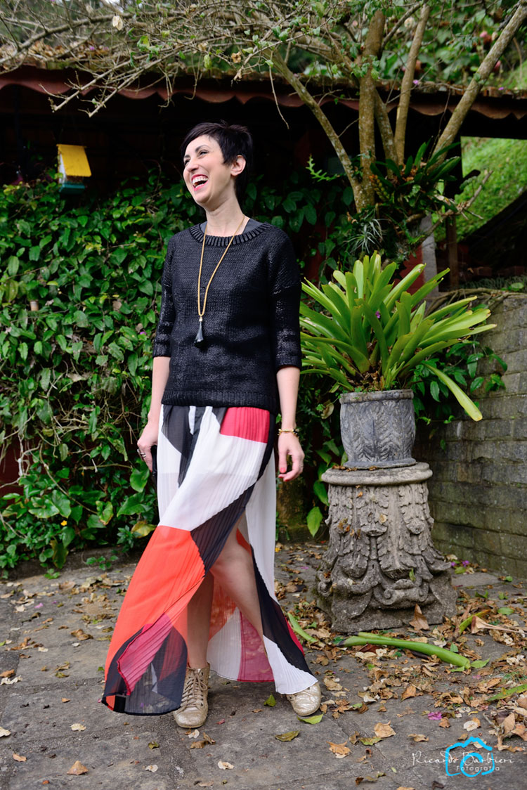 Bom, demorou, mas pintou uma oportunidade de um evento descolado e foi assim que eu tirei o mofo do dito cujo e fiz do vestido uma saia, sobrepondo meu tricô encerado! Como eu estou atacadíssima de problema na coluna, tô maneirando um pouco na brincadeira dos saltos e abusando das sapatilhas e tênis.