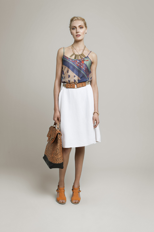 Esse é do lookbook da Maria Filó. Regatinhas de seda estampadas e lisas, outros itens da lista. Uma saia clássica com um bom corte. E reparem como os acessórios são fundamentais nessas produções…