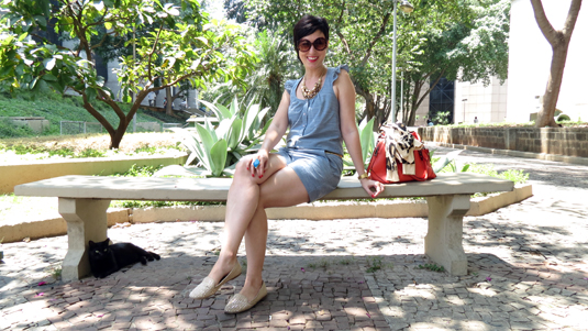 Linda, linda, linda!!! Como sempre, aliás! Incrível como os acessórios mudam a cara de um look, né? O macaquinho é fofo, mas assim, comum, principalmente de frente. Daí você põe o cinto dourado, a bolsa colorida e o colar e fica tudo maravilhoso!!!