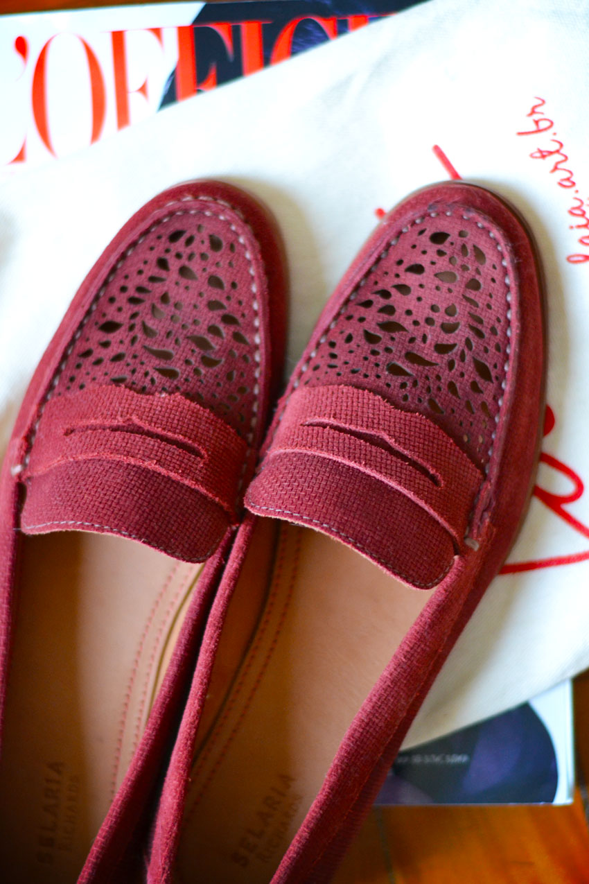 Eu nem reparei direito na roupa, só consegui olhar para o mocassim. É lindo de morrer!! E que vermelho maravilhoso é esse!!