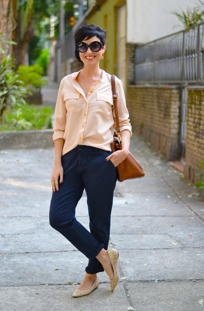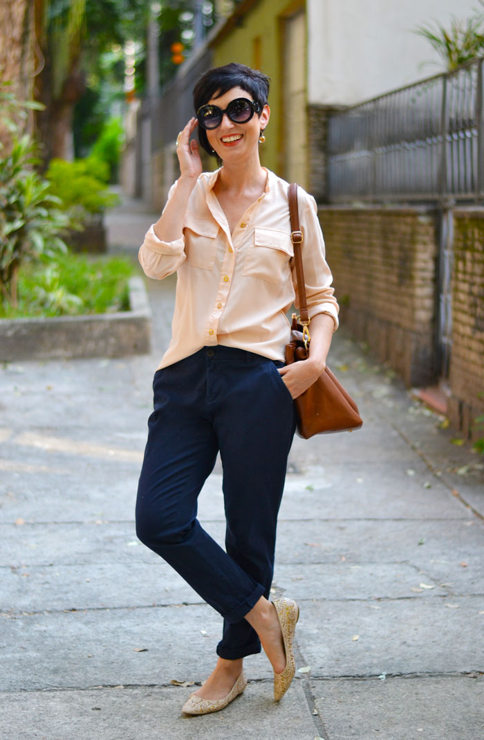 Aí meu primeiro pensamento foi chegar e mandar ver no feijão com arroz da combinação: calça preta e camisa branca. Sem erros, elegante sempre, com todos esses códigos de quando vestimos algo dentro da nossa zona de conforto. Abri o armário esbaforida e olhei a calça azul marinho…pensei em subverter essa mania que temos do preto ser sempre a cor certeira, à prova de erros, a que combina com tudo, emagrecedora, que sinaliza elegância, e por aí vai!