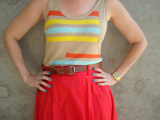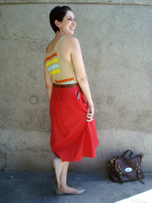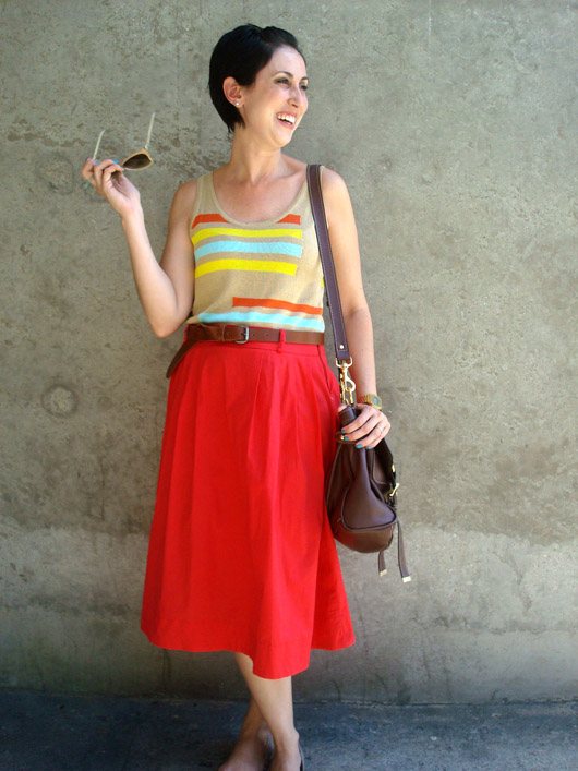 Curto muito a saia (realmente parece que tá um pouco grande, mas ainda assim eu acho que ficou linda em vc) e as cores. Acho que a vida fica mais bonita se for colorida!!!